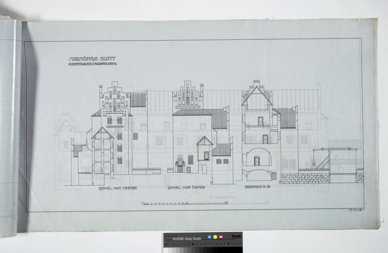 Restaureringsförslag till Malmöhus Slott. Fasadritning, gavelfasad mot väster och öster samt tvärsektion av slottet och bron skala 1:100.
