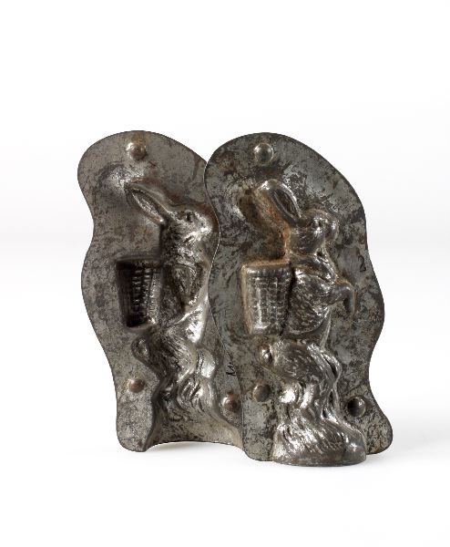 Chokladform av plåt med motiv av påskhare. 3 st. halvor.