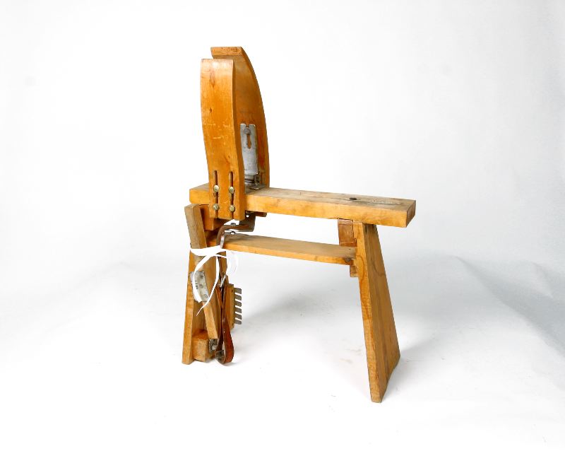 Syklove fastsatt på bänk. Trampa och läderrem kopplad till den ena klämman som är monterad med gångjärn och fjäder.