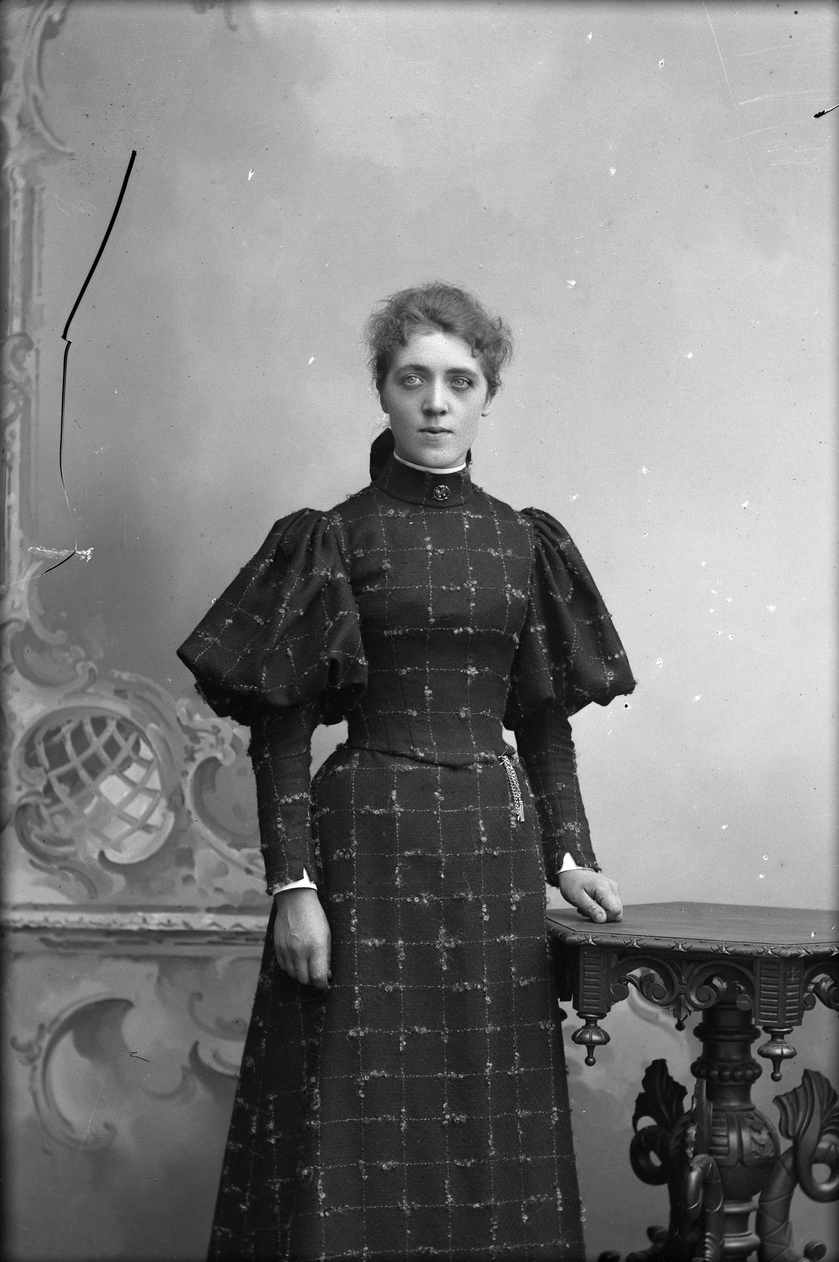 Porträtt i helfigur av Charlotta Svahn, stående vid pelarbord. Hon är vid fototillfället ingående i grosshandlare Gustaf Adolf Hedmans (1827-1906) hushåll.
