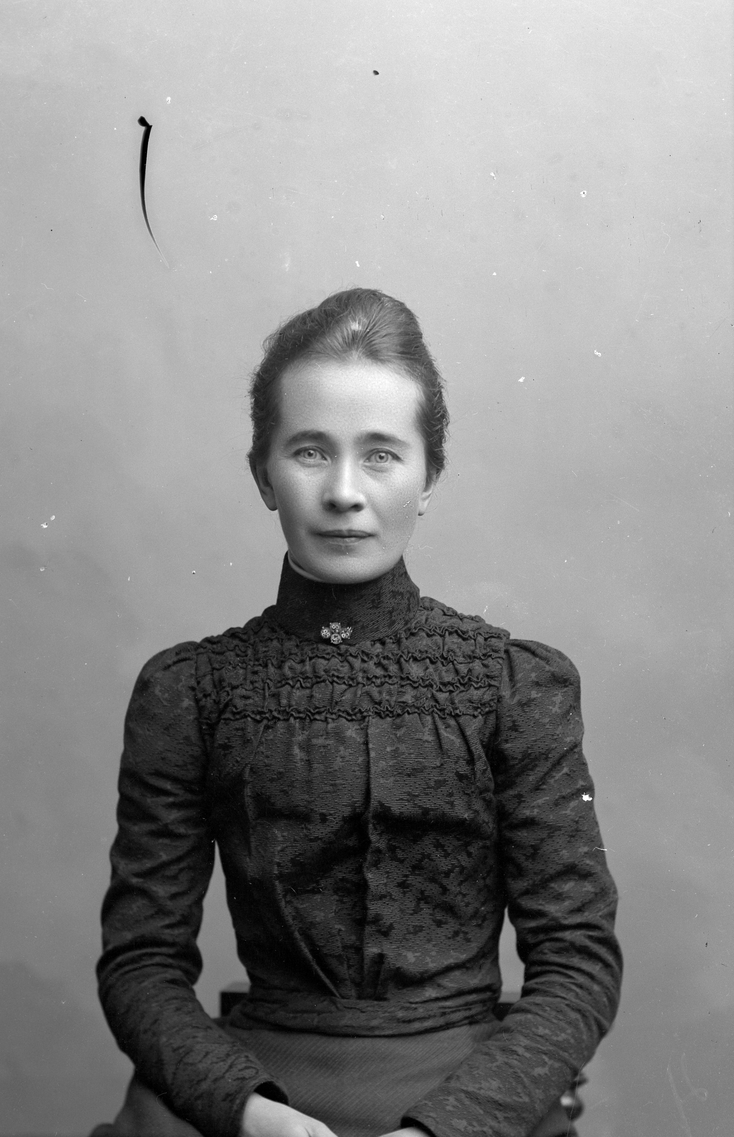 Porträtt i halvfigur av Carolina Larsson, sömmerska vid Malmö Gamla Garnbod.