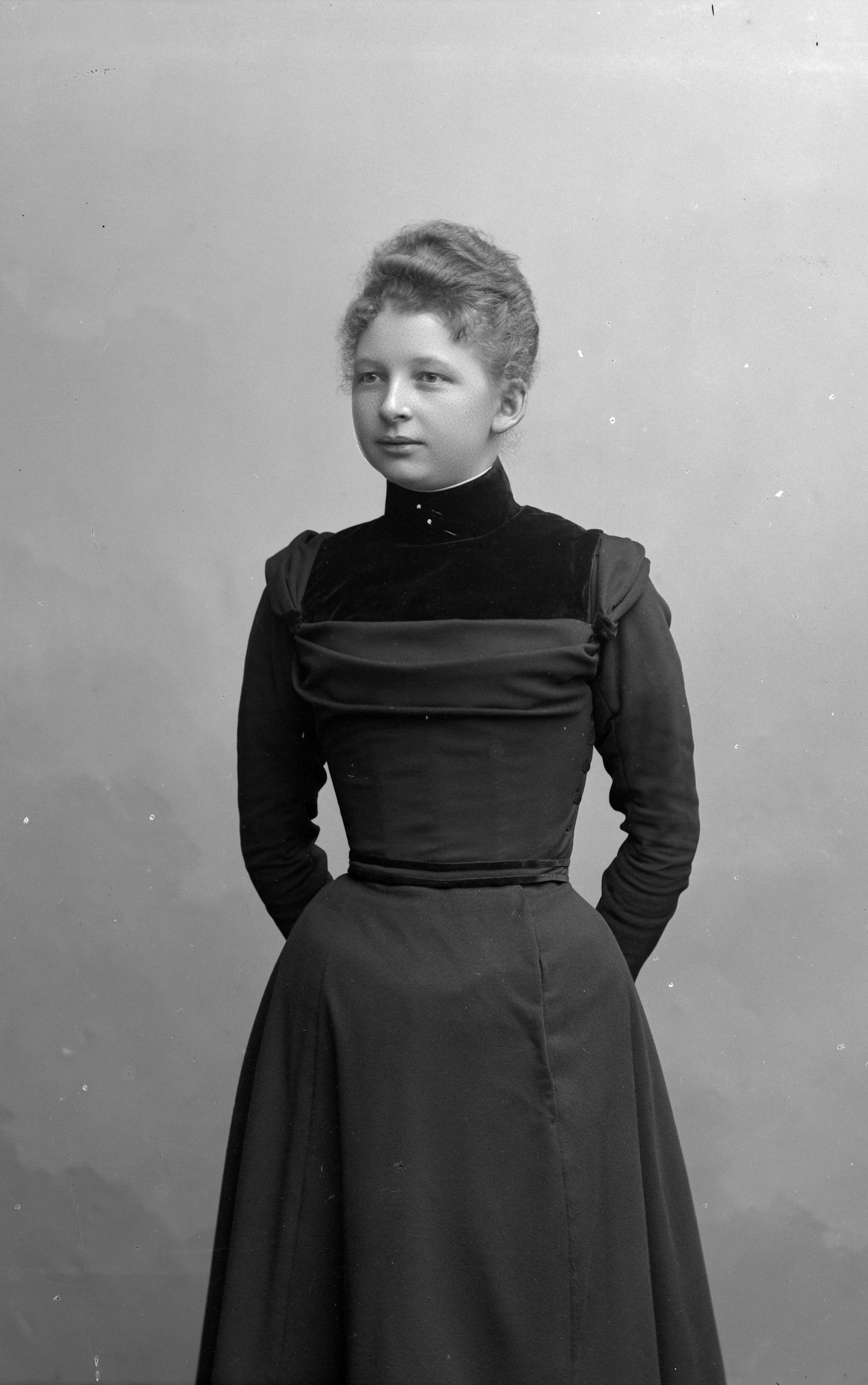 Porträtt i helfigur av Ellen Persson, butiksbiträde vid August Sandgrens Vitvaruaffär.