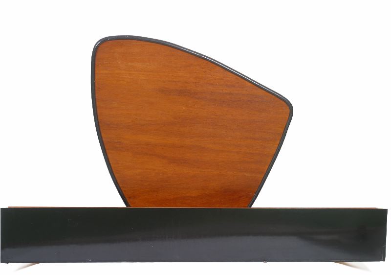 Skärm, avsedd att monteras på vägg som avskiljare mellan frisörplatserna. Av brun fanér med list i svart kompositmaterial. Väggfäste av trä.