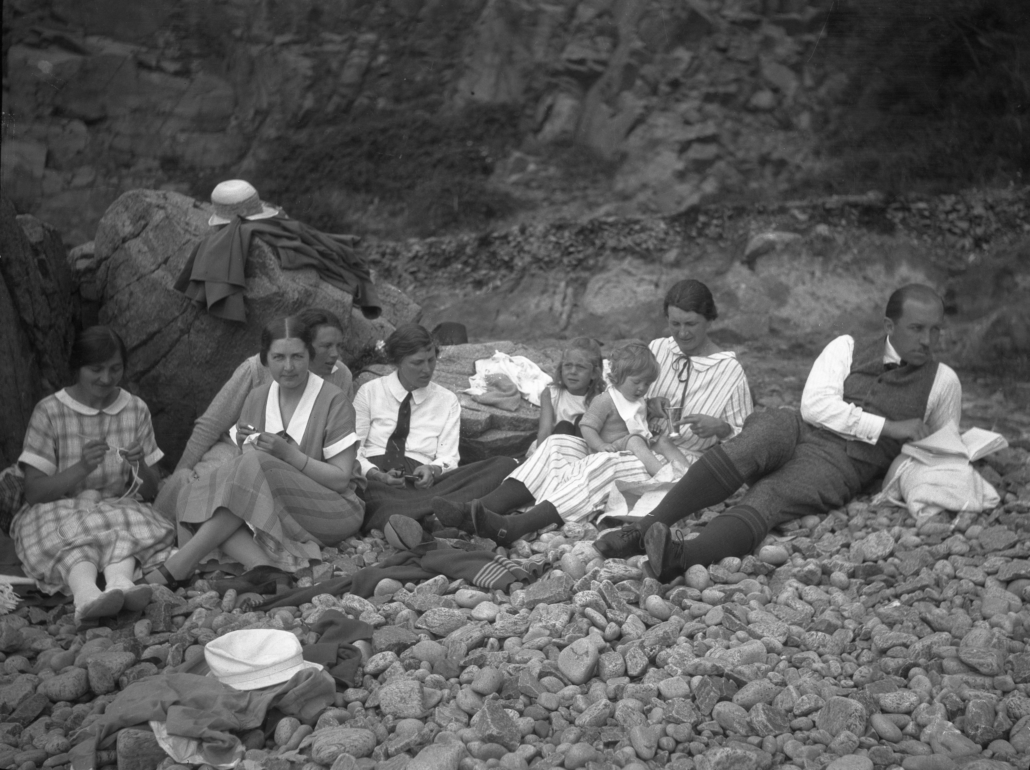 Sällskap på stranden - Clara, Milly, Ellen, Henny, Märta, Maria, Kjell.