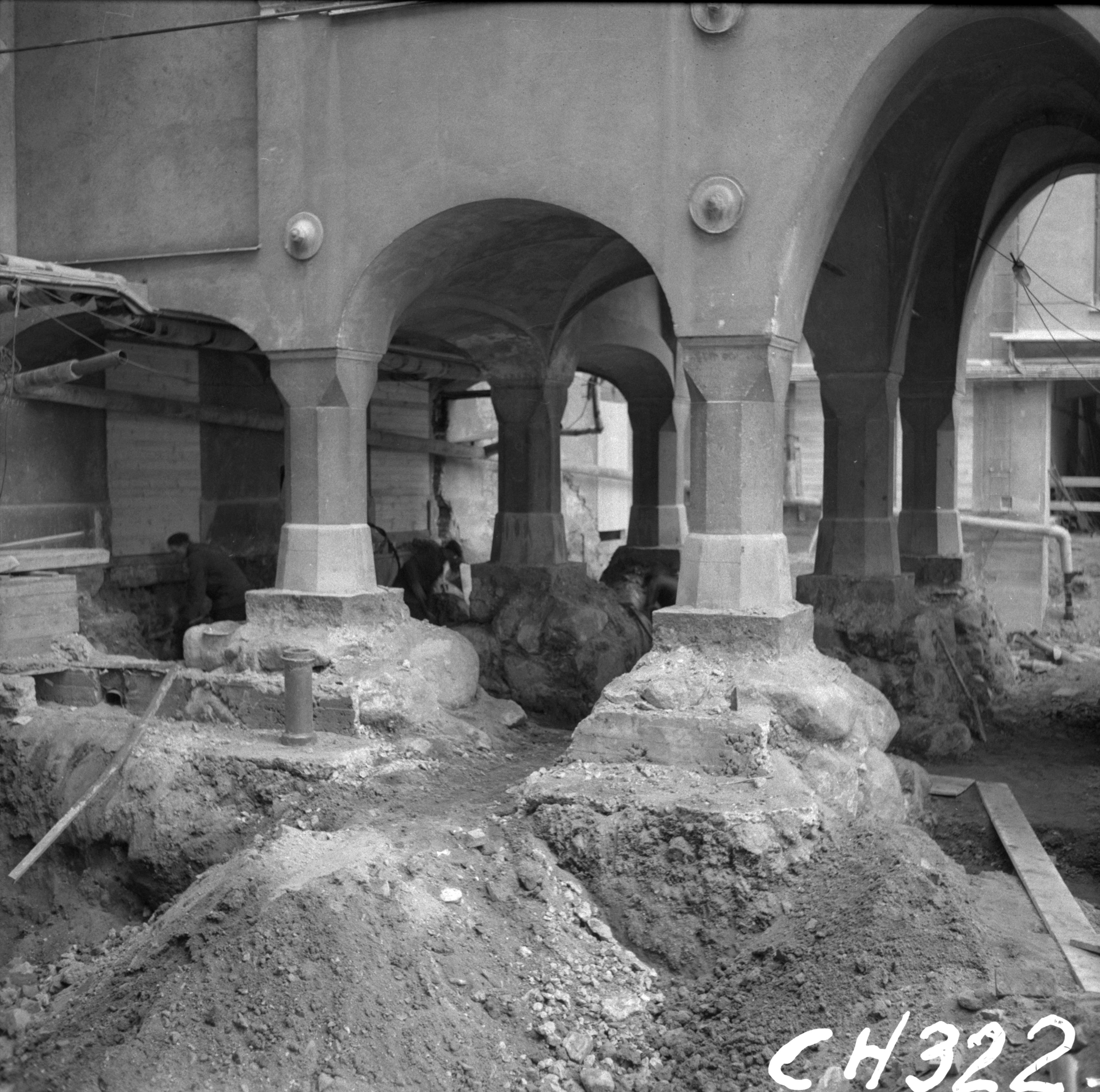 Arkeologisk utgrävning under byggnad med skulpterade stolpar.