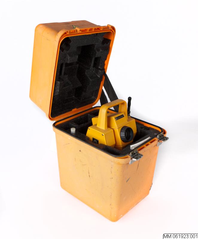 - En totalstation i transportväska av plast. Med bärremmar och lyfthandtag. Märke: Geodimeter 620. Väskan innhåller en instrumentenhet på en trefot, ett vitt regnskydd, en antenn, en nyckel, en antal små verktyg, en bruksanvisning i kortform. Den löstagbara kontrollenheten saknas och är på intrumentenheten täckt med en kåpa. Utrustningen är funktionsduglig. Service/kontrolletikett daterad 2010-06-03.
