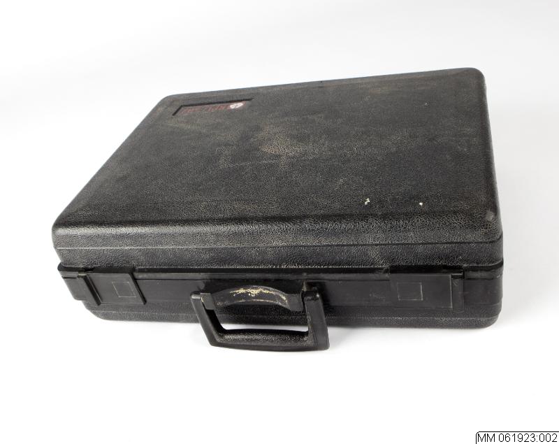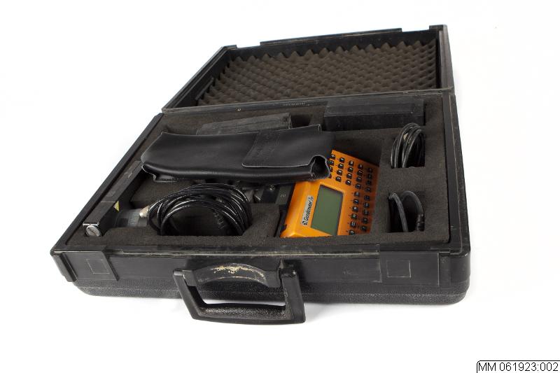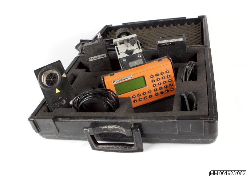 - Transportväska märkt RPU 602 med tillbehör till totalstationen MM 61923:001.Väskan innehåller en löstagbar numerisk enhet av typ CU ALFA 571 204 210 med serienummer 67216897. En spegel märkt Geodimeter Remote target med part no 571 202 220. Diverse (3 olika) kablar. En svart sändare(?) med lös antenn, batterienhet och skyddsfodral.