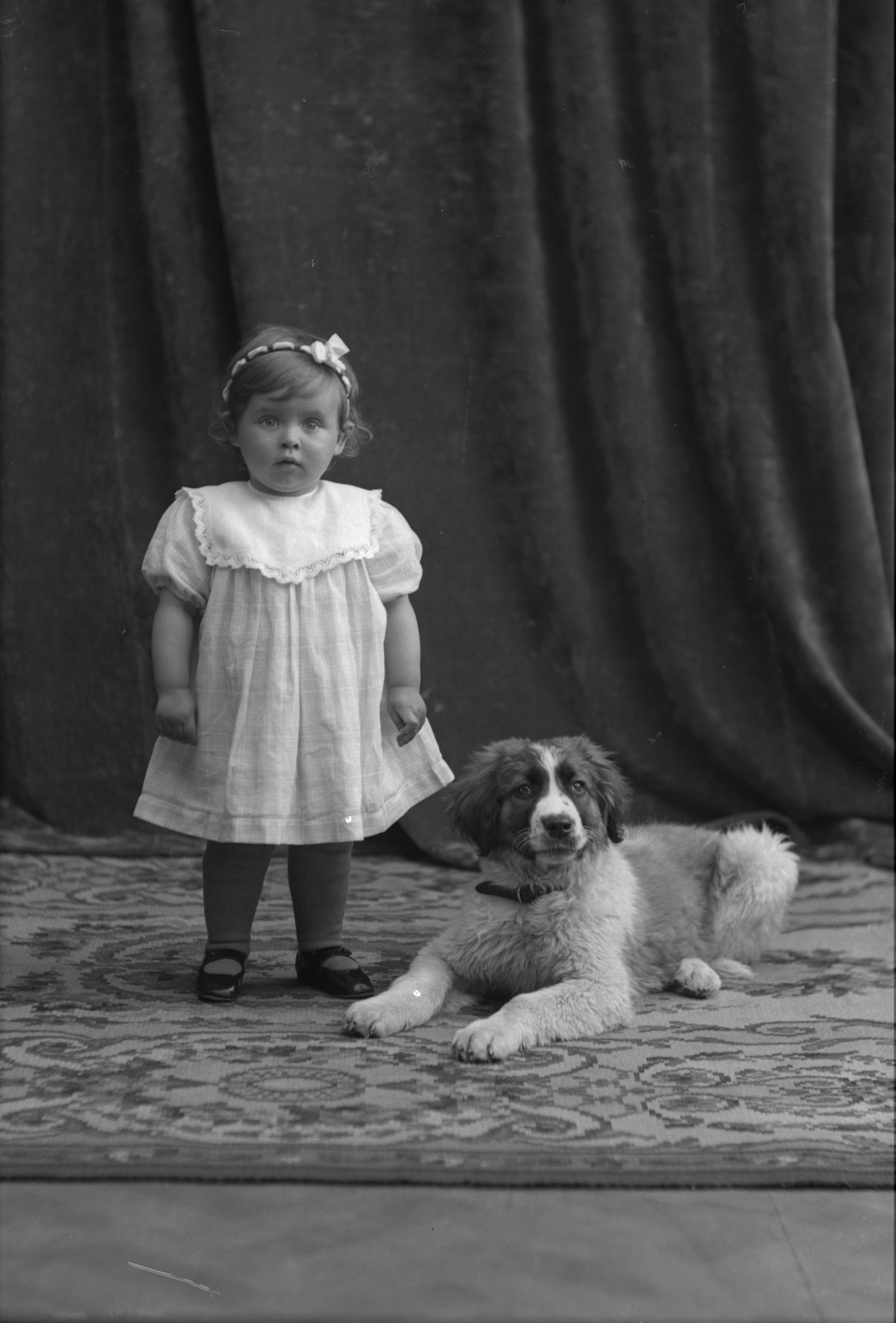 Porträtt i helfigur av Margareta Lange, tillsammans med sin hund.