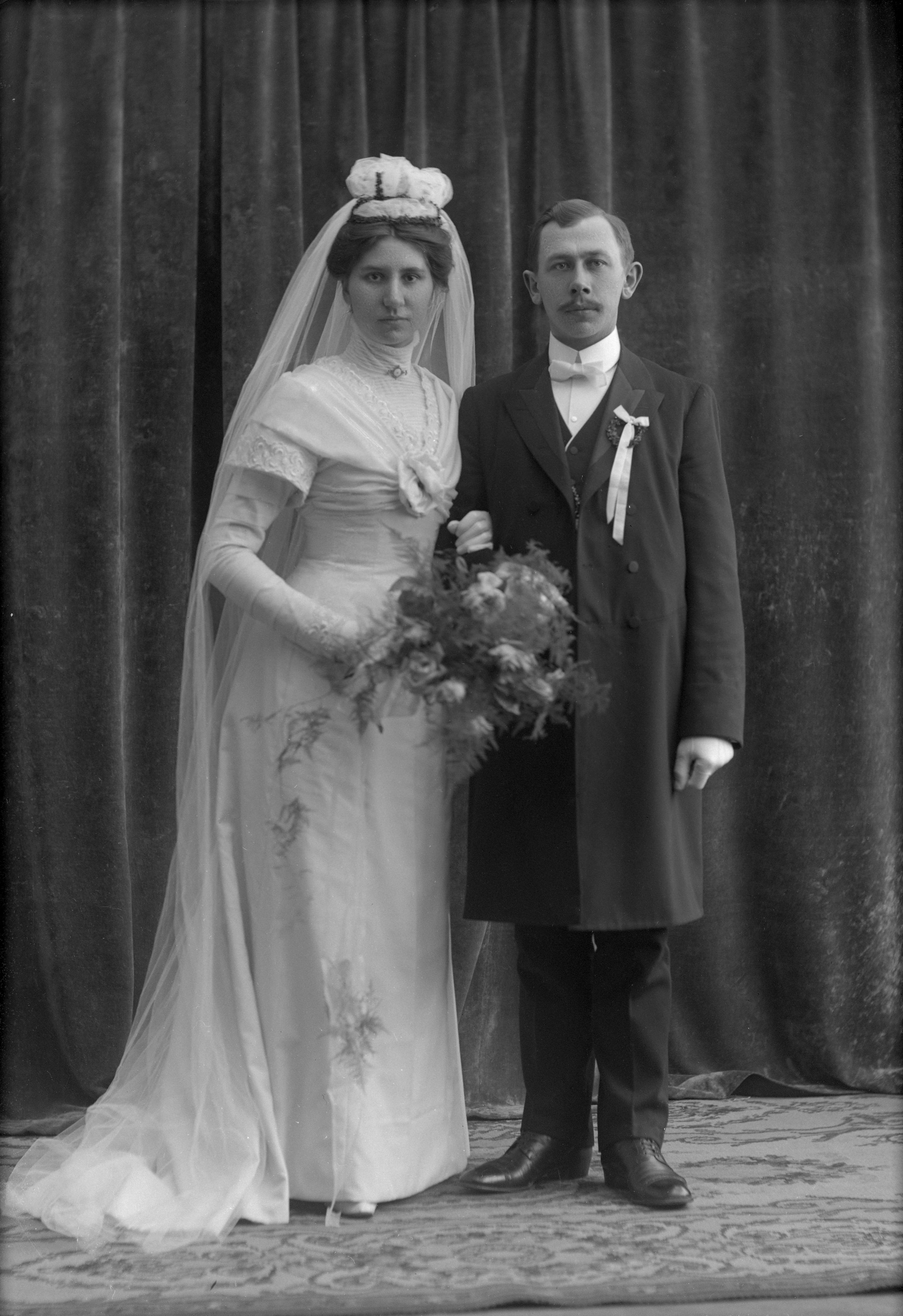 BS 005859 :: brudklänning, brudgumsklädsel, blombukett, draperi