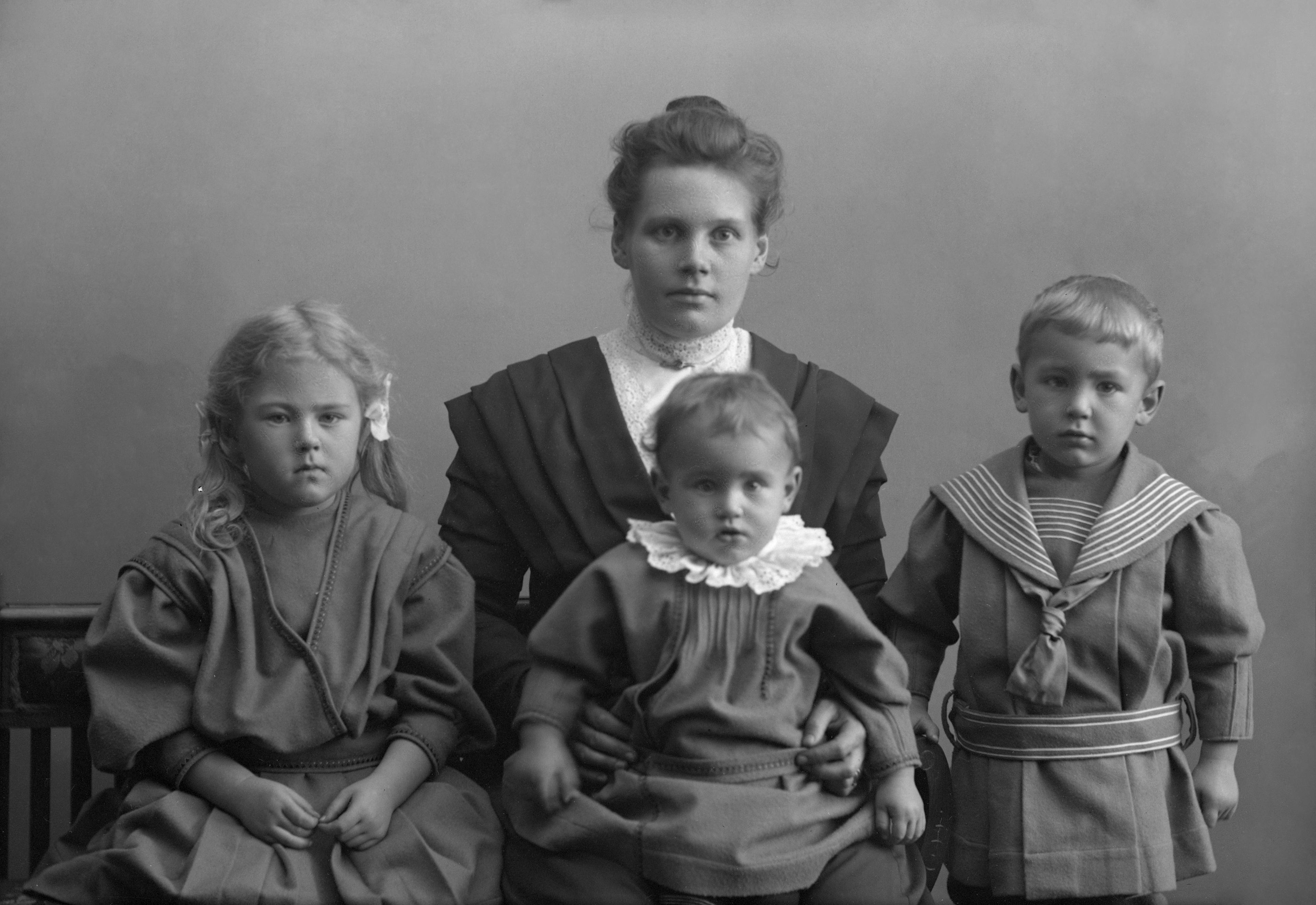 Porträtt i halvfigur av Karin Löfberg med sina barn, Greta, Sten och Tor.