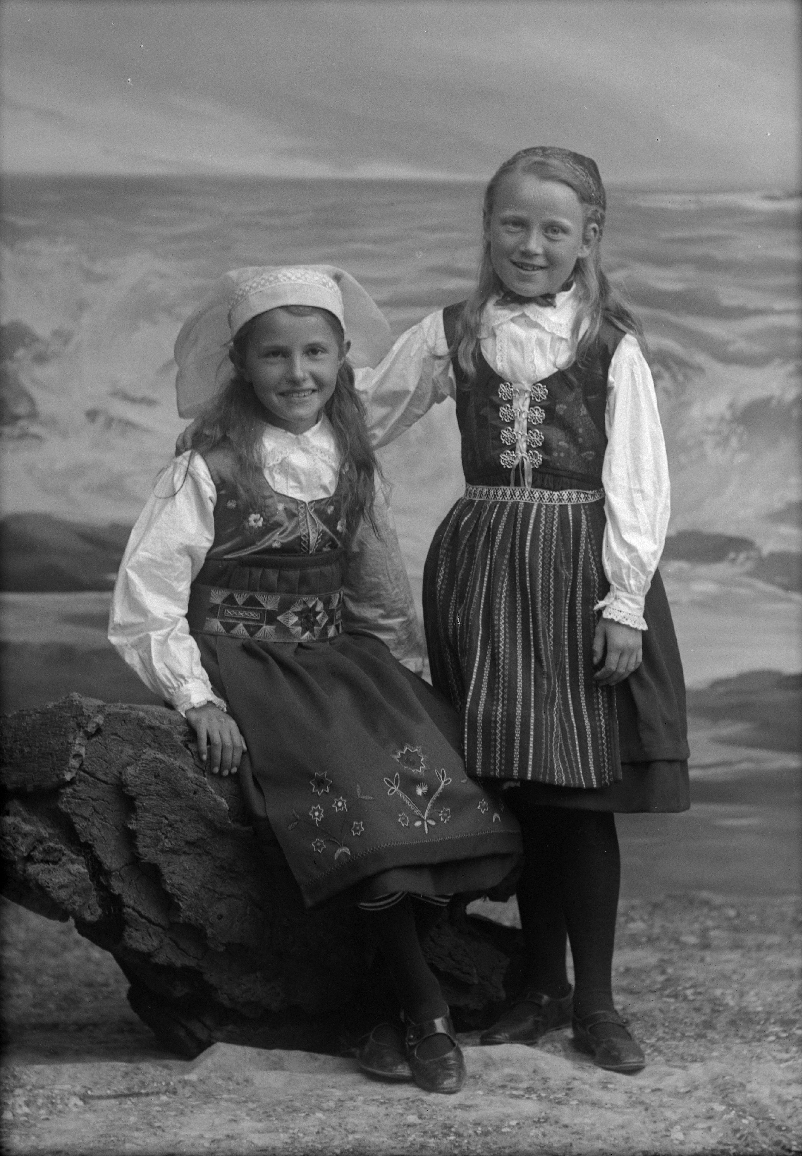 Porträtt i helfigur av två oidentifierade flickor, iklädda folkdräkter. En av flickorna sittande på stenhäll. Ateljéfond med stormigt havsmotiv utgör bakgrunden.