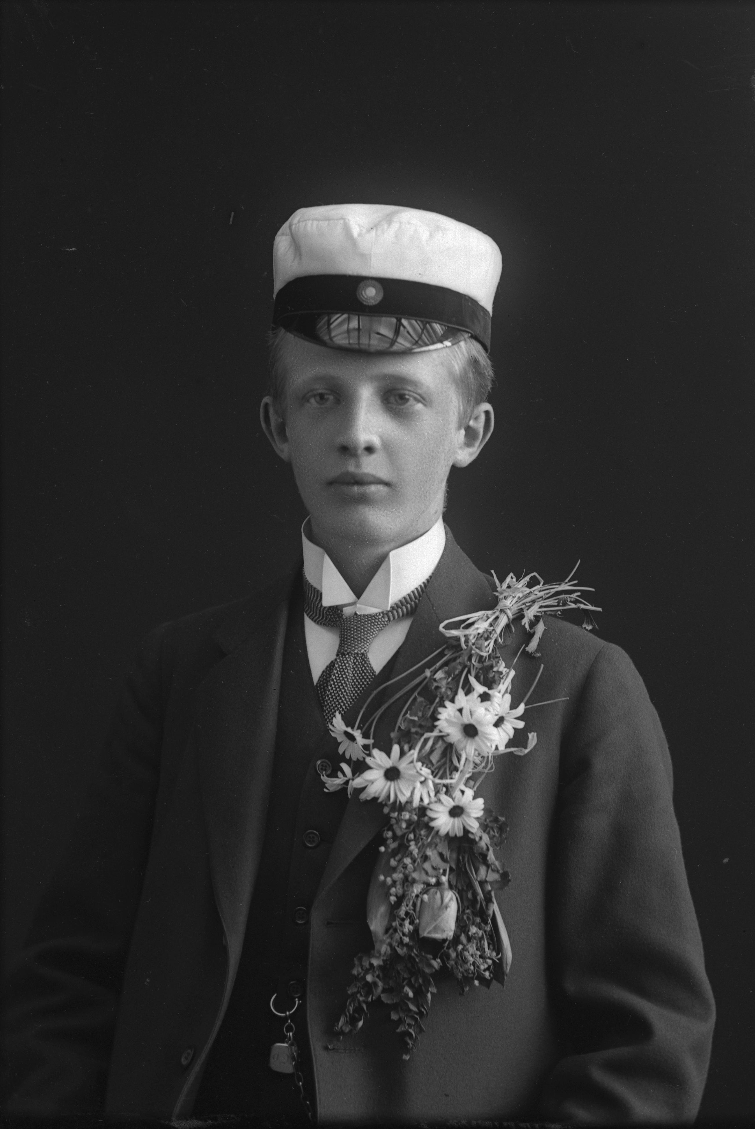 Porträtt i halvfigur av Torsten Malmros, iklädd studentmössa och blomster.