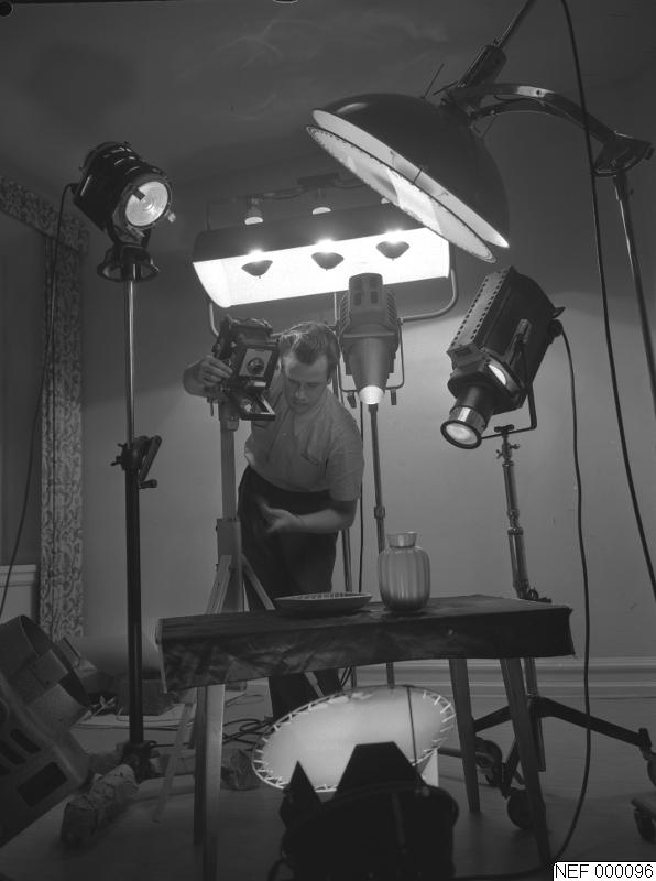 NEF 000096 :: fotoateljé, interiör, fotoutrustning, kamera, fotolampa, keramikvas, keramikfat, fotograf, man