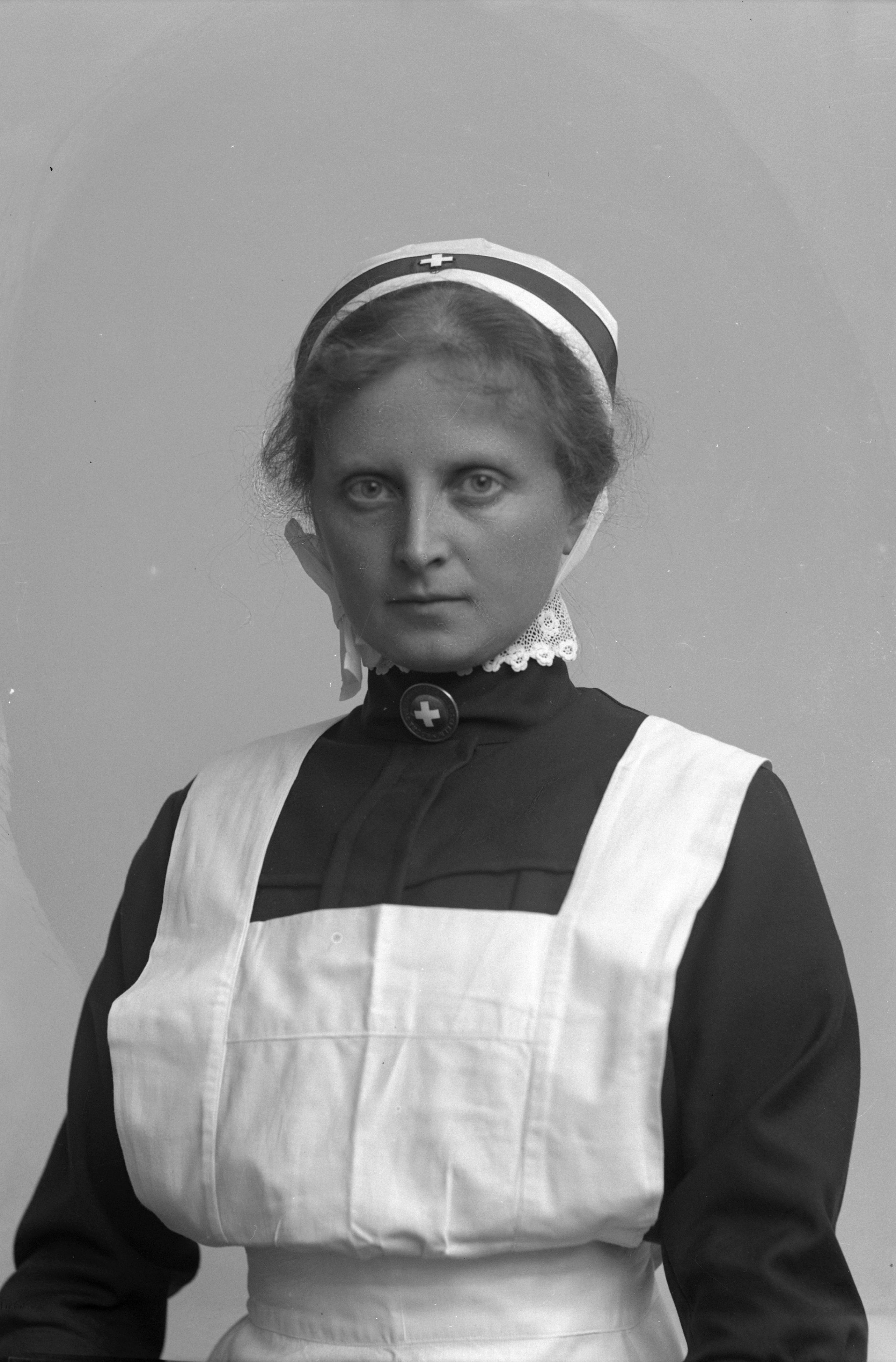 Porträtt i halvfigur av Nathalia Persson, iklädd sjuksköterskeuniform.