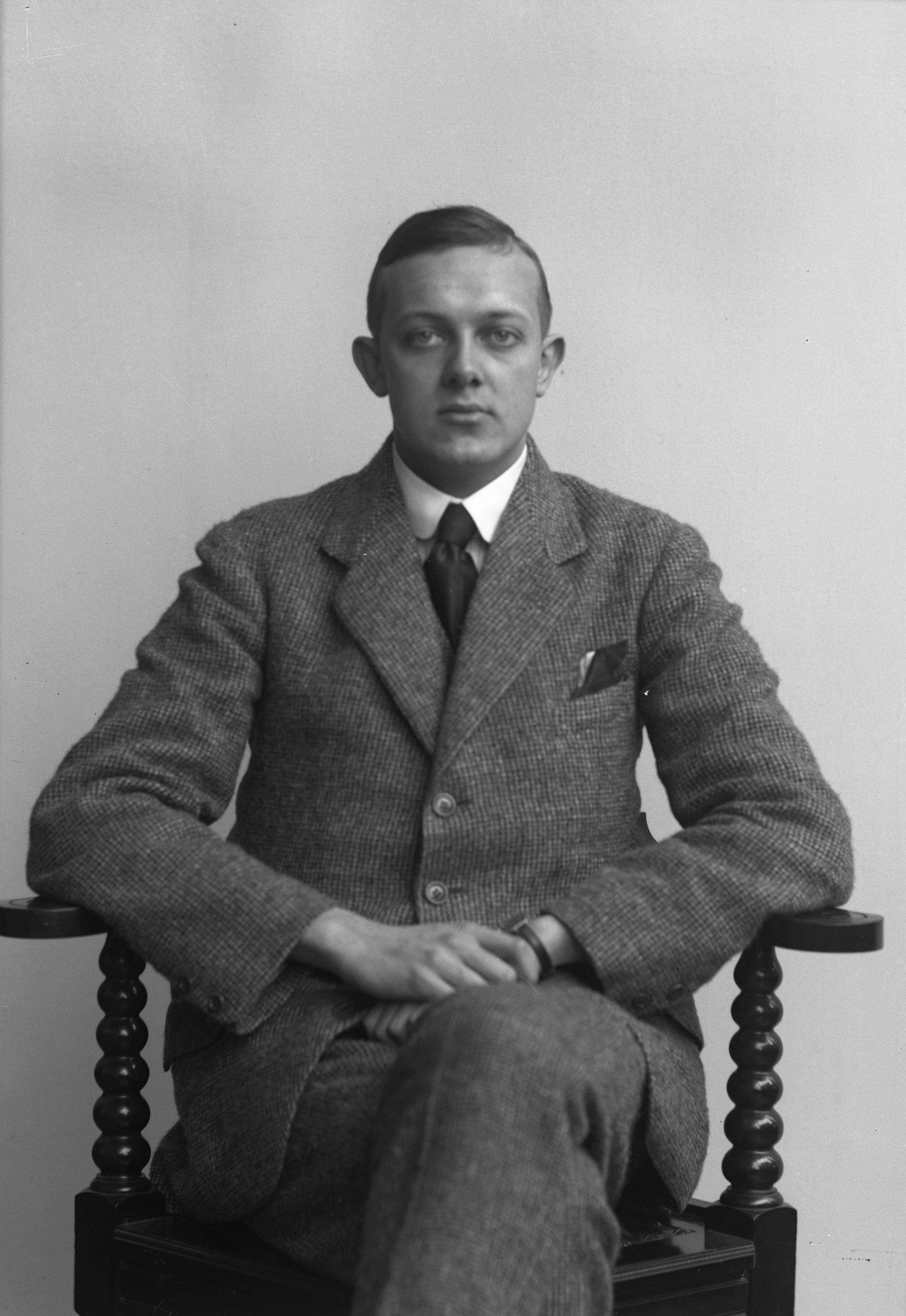 Porträtt i helfigur av direktör Nils Carlsson, sittande i stol.