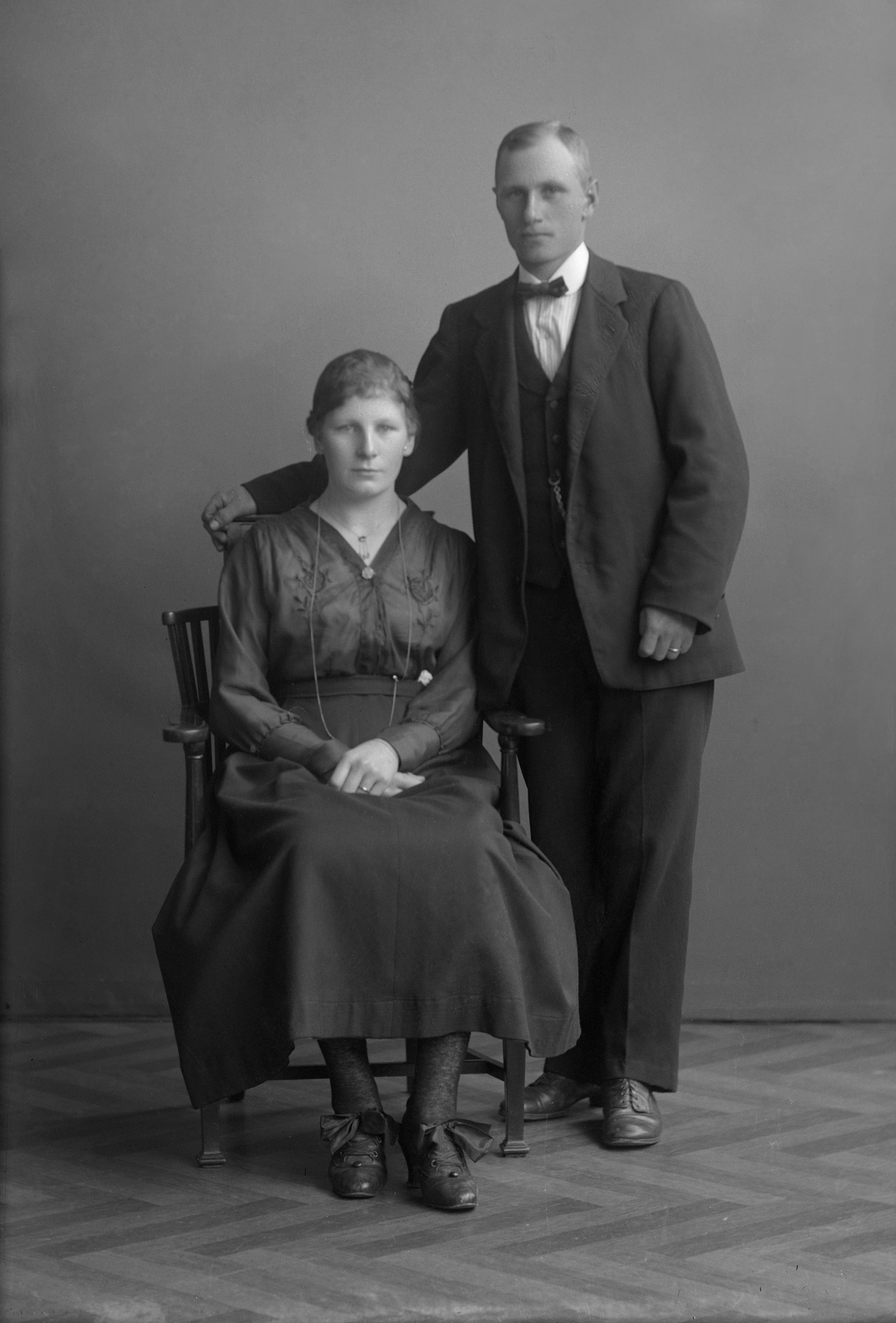 Porträtt i helfigur av Ester Gustafsson, sittande i stol, med fästman.