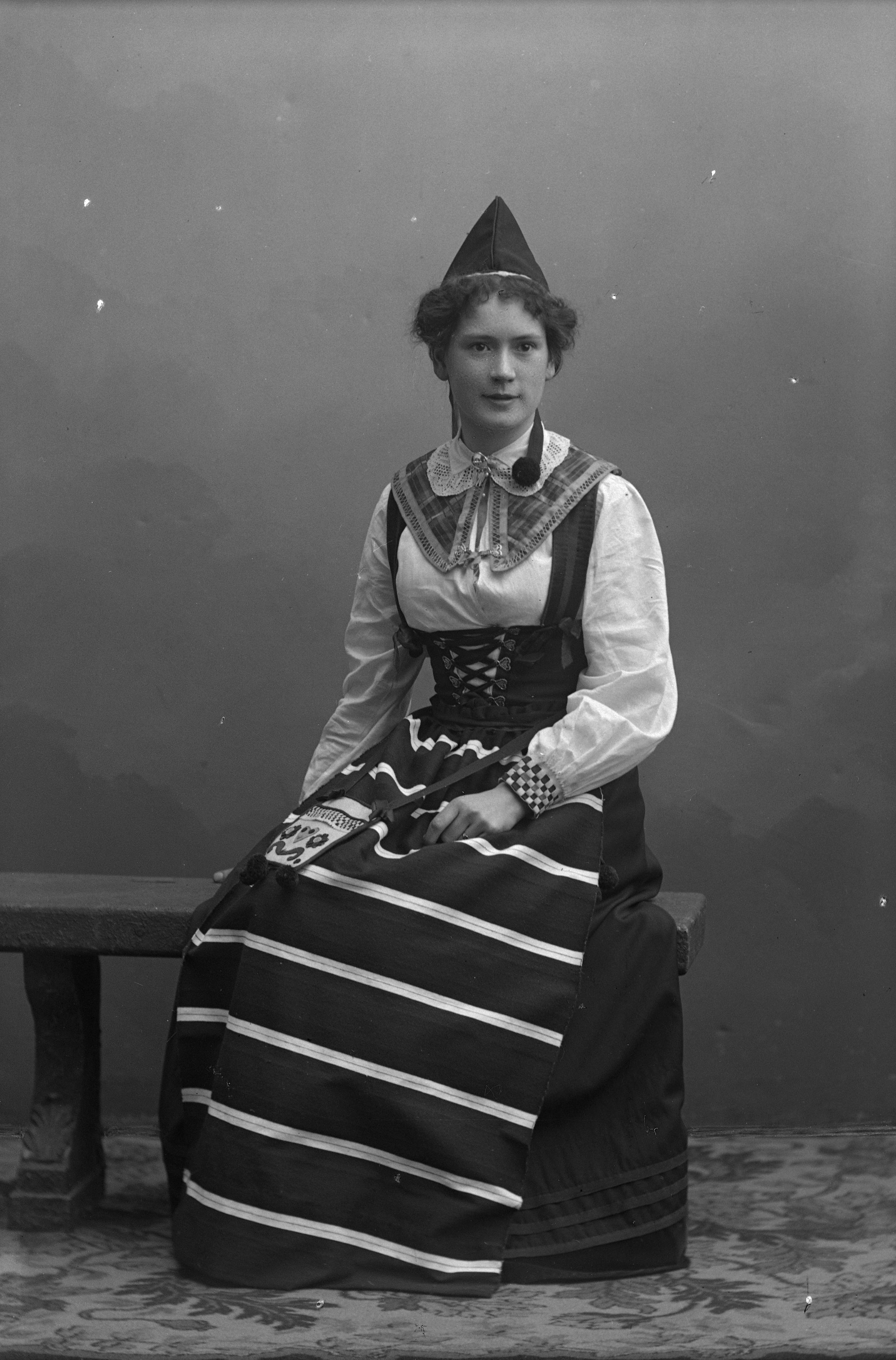 Porträtt i helfigur av fröken Grytz, iklädd folkdräkt, sittande på stenstaket balustrad.