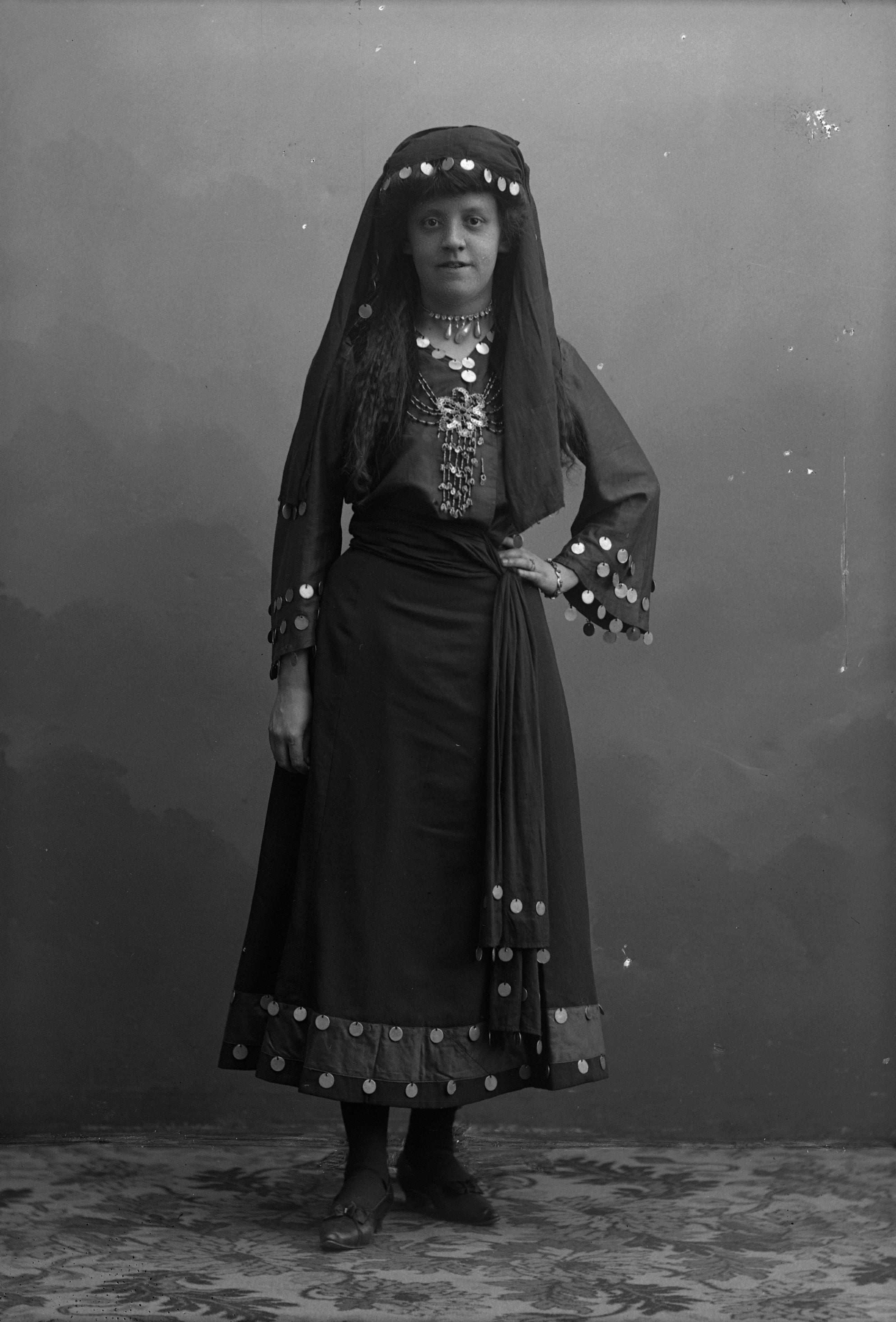 Porträtt i helfigur av Elfrida Andersson, iklädd romsk folkdräkt.