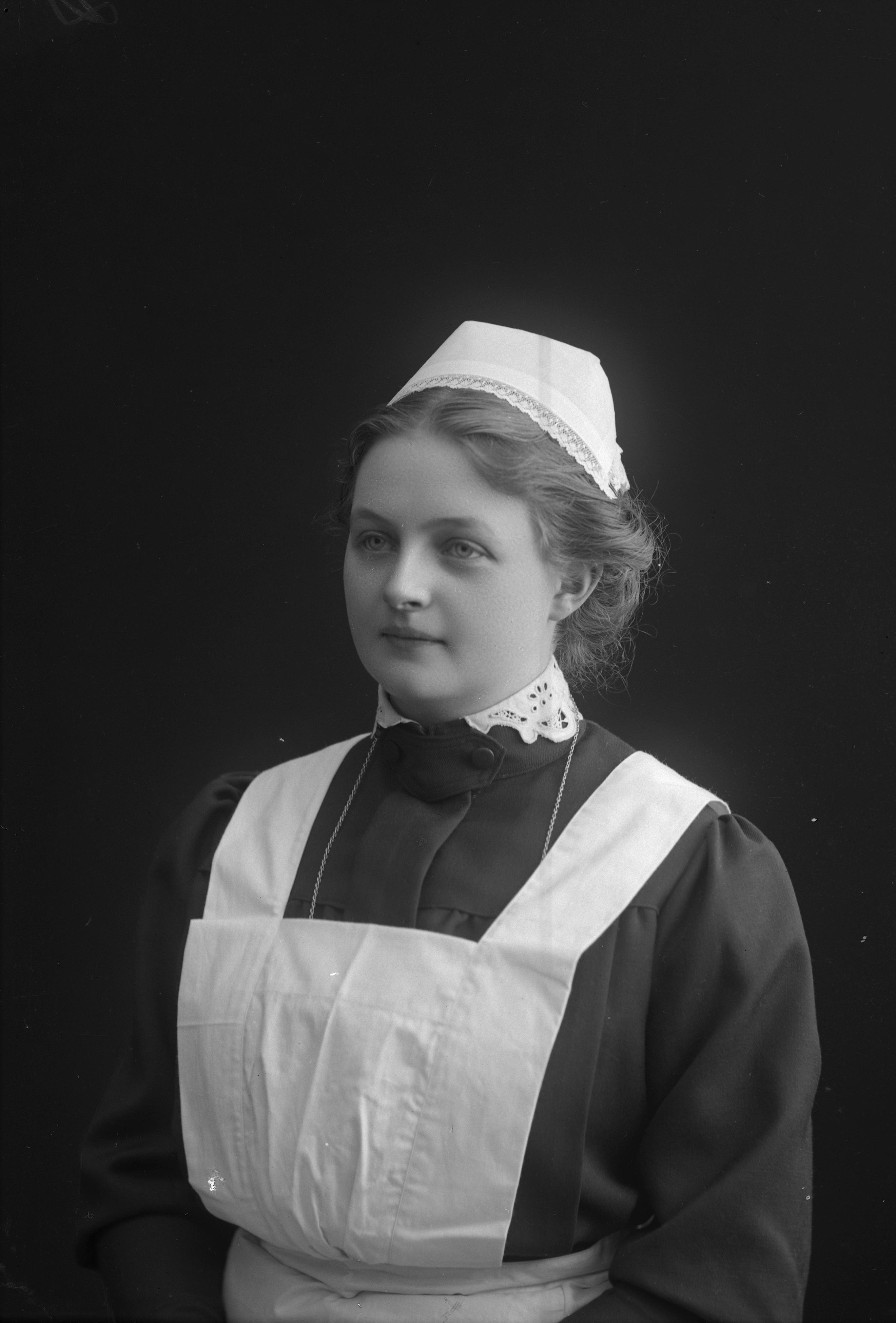 Porträtt i halvfigur av fröken Thomsson i sjuksköterskeuniform.