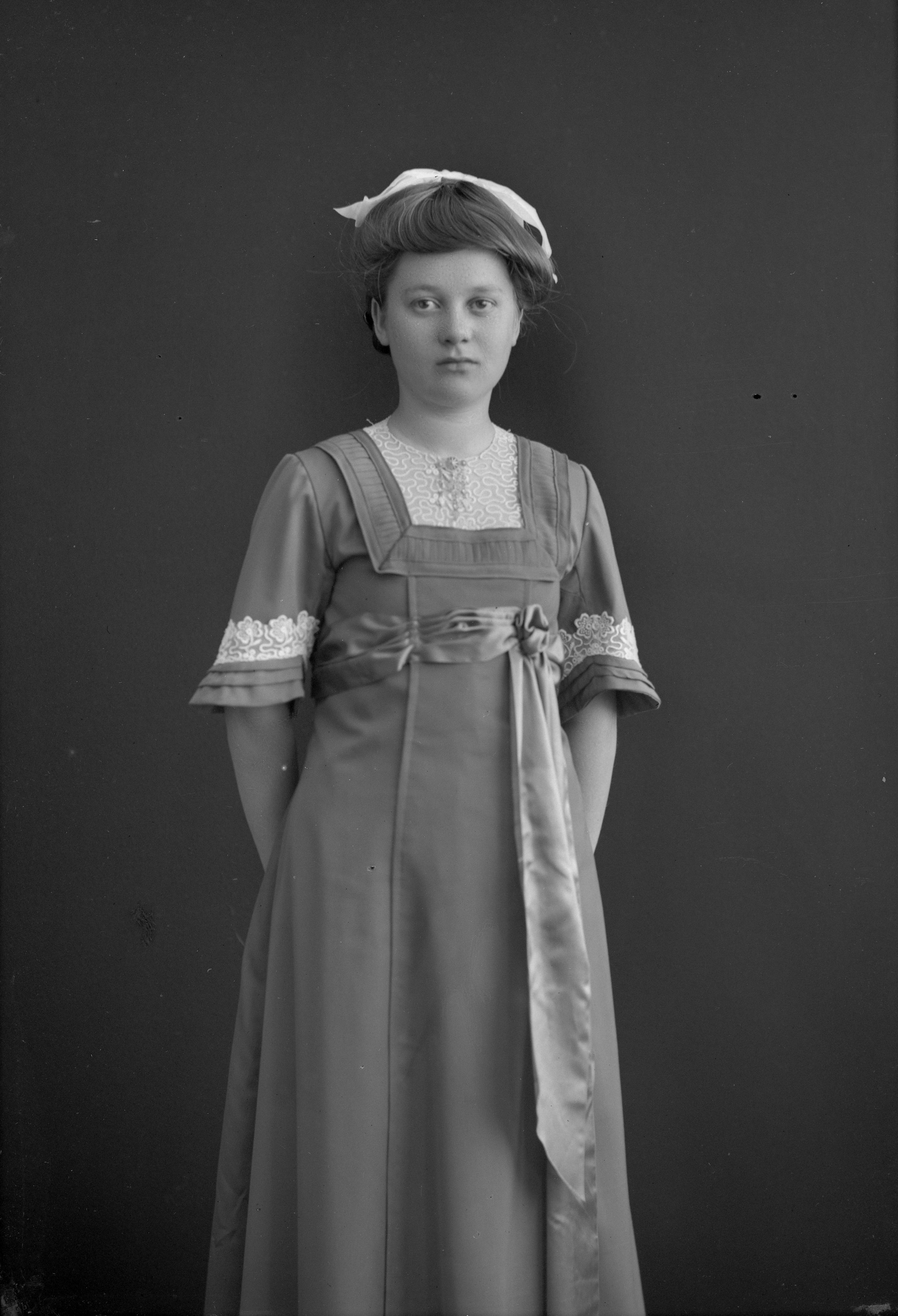 Porträtt i helfigur av Emmy Åkesson vid Limhamns Gipsfabrik.