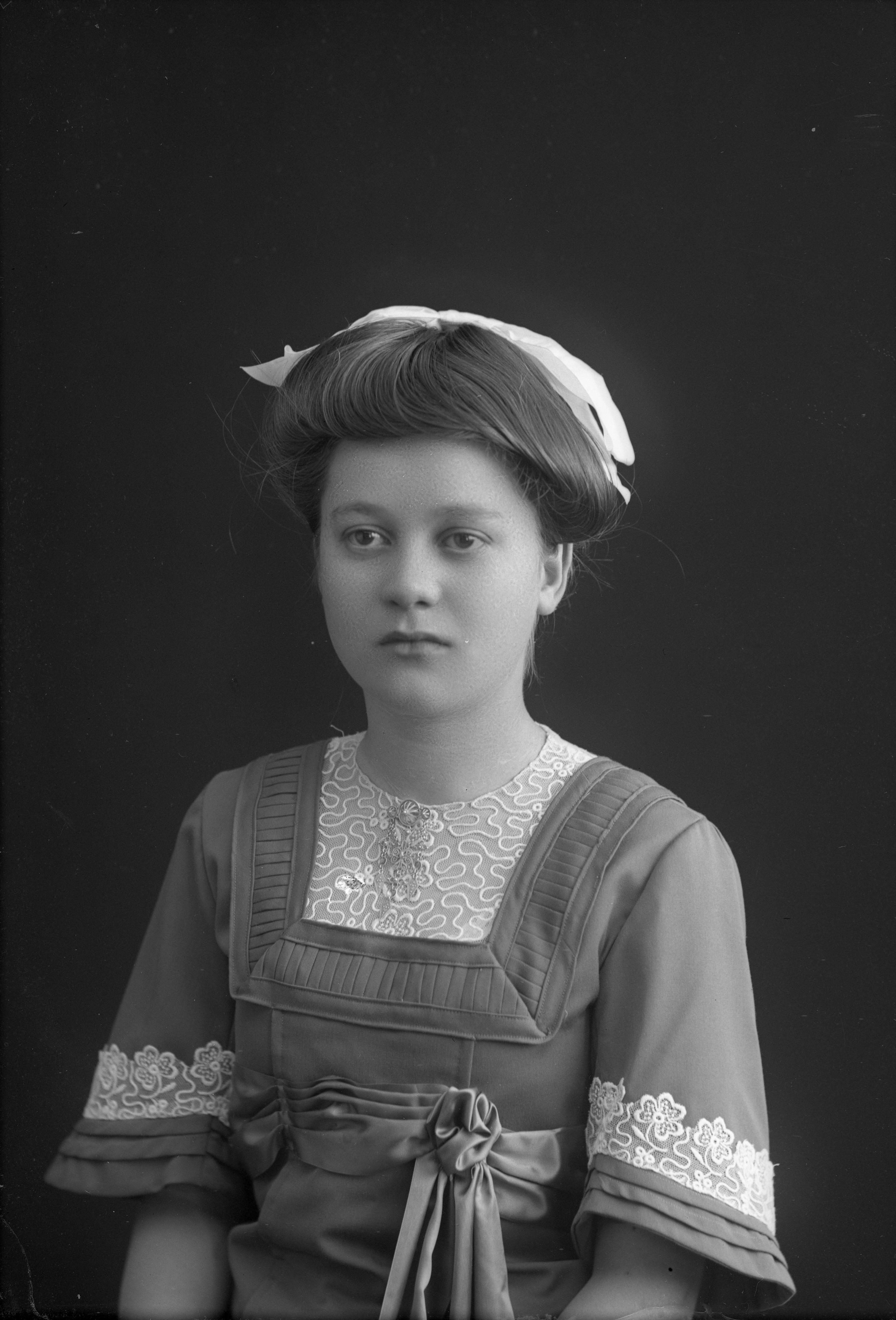 Porträtt i halvfigur av Emmy Åkesson vid Limhamns Gipsfabrik. Hon bär en stor, ljus rosett i håret.