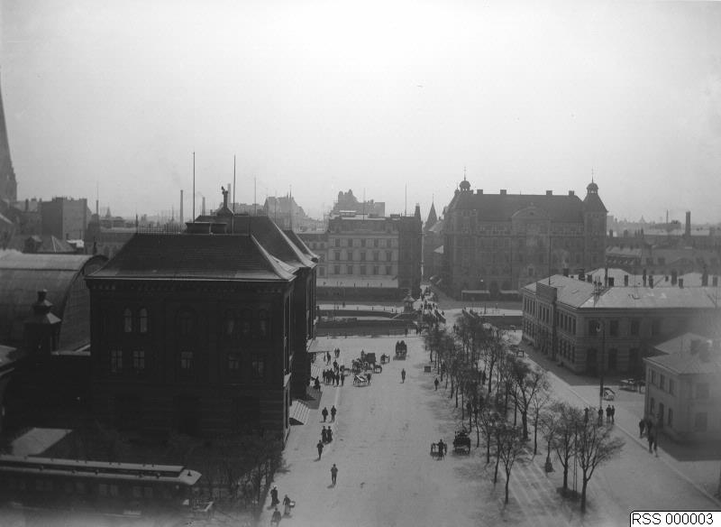 Gatubild tagen från Posthuset: Malmö C och Börshuset i förgrunden, i bakgrunden Norra Vallgatan vid Hamngatan.