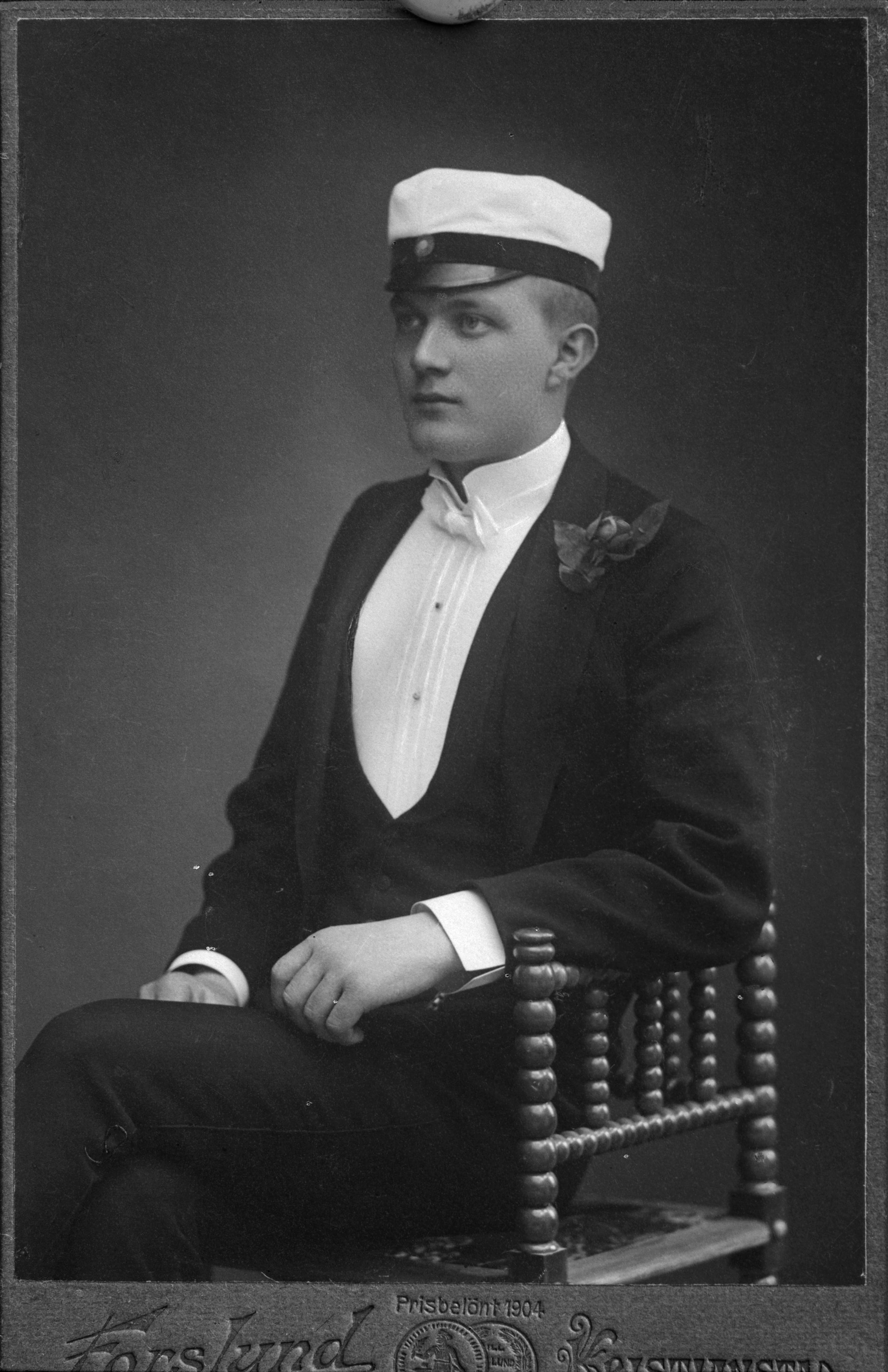 Porträtt i helfigur av veterinär Andersson, iklädd studentmössa. Visitkort med ateljélogotyp, "Forslund /Krisitanstad /Prisbelönt 1904".