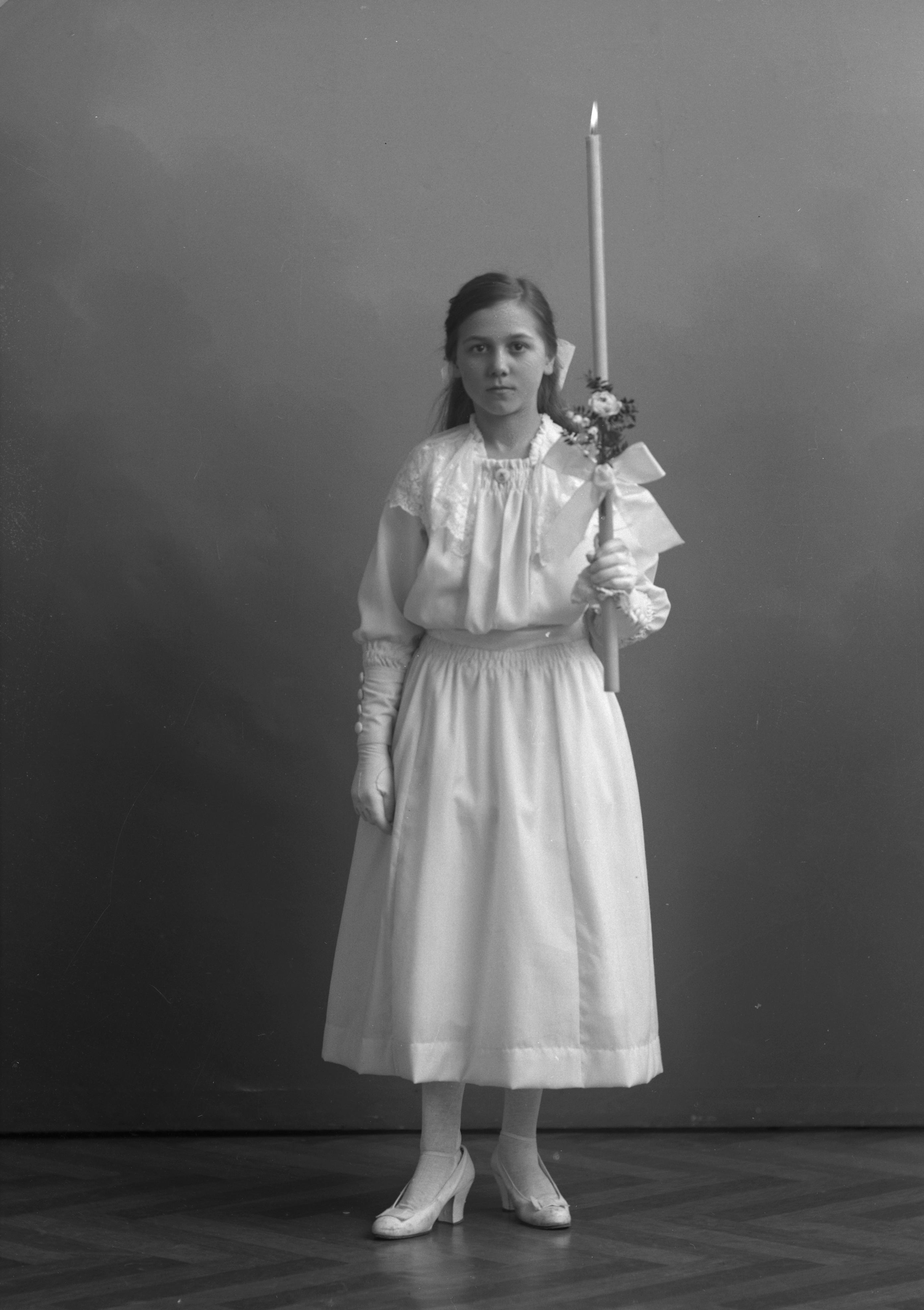 Porträtt i helfigur av Herman Wieths dotter hållande långt stearinljus med rosett och blomster.