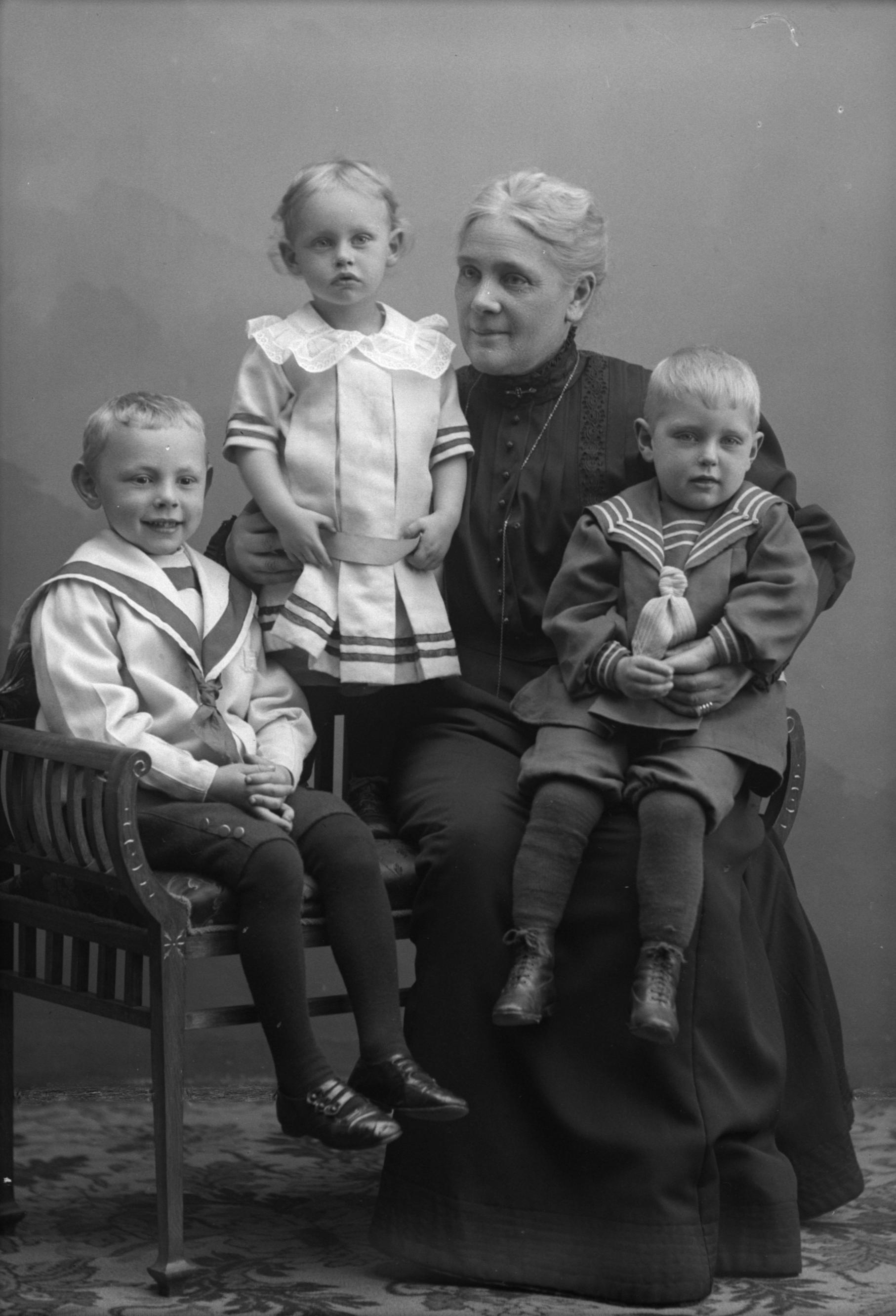 Porträtt i helfigur av Helena Jahnke med sina barnbarn, sittande på bänk.