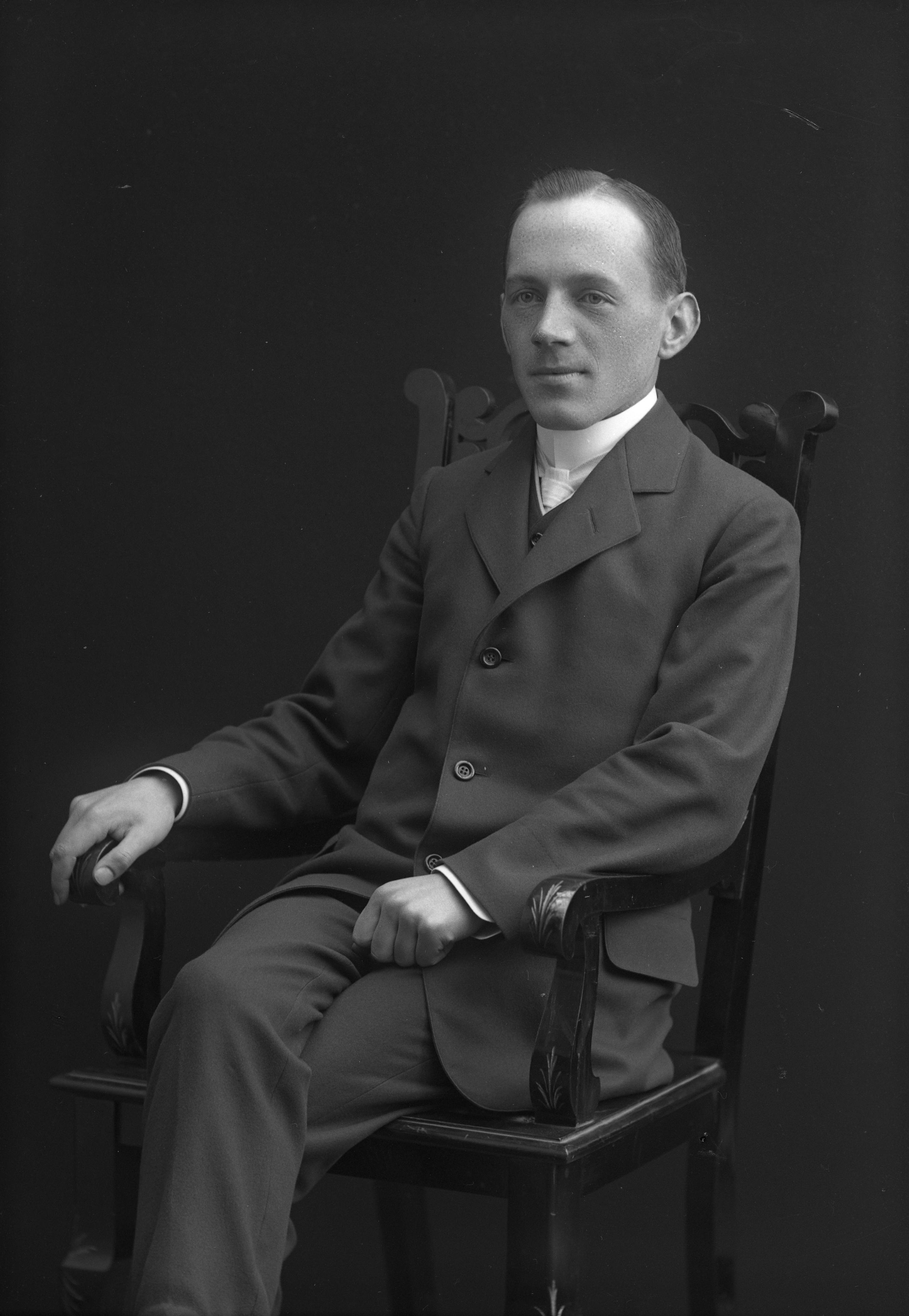 Porträtt i helfigur av posttjänsteman August Rooth, sittande i stol.