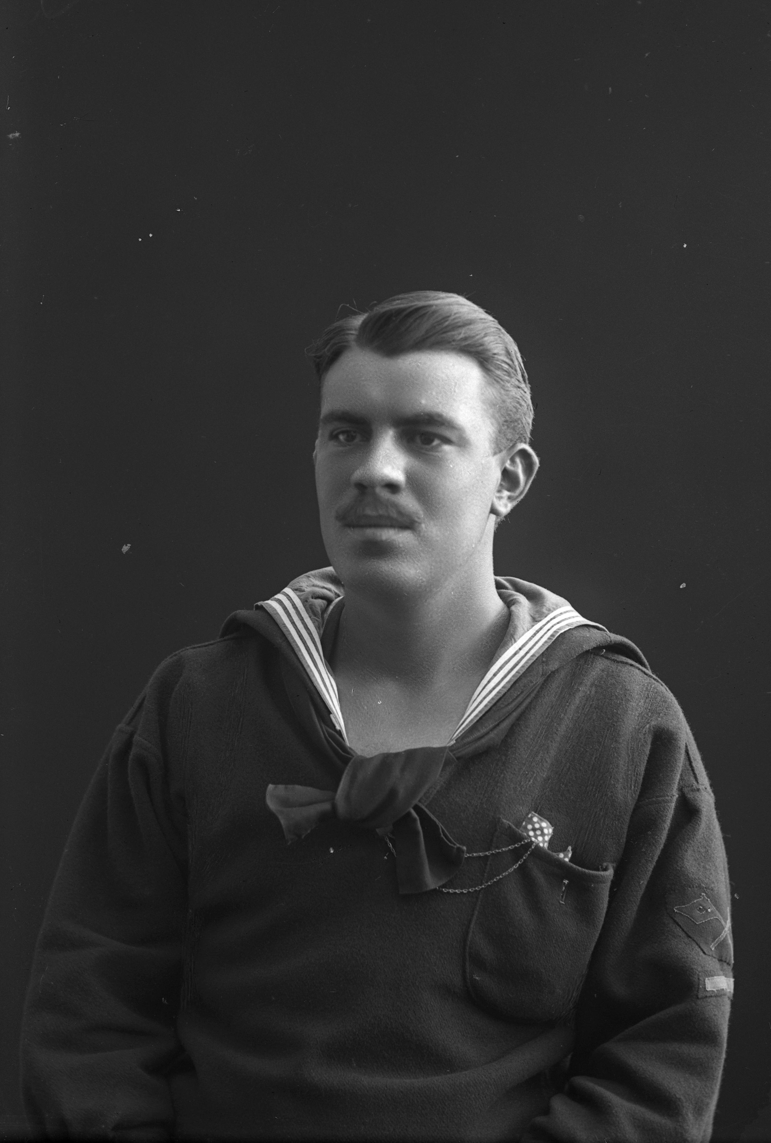 Porträtt i halvfigur av signalmatros Martin Norrby, iklädd sjömanskostym.
