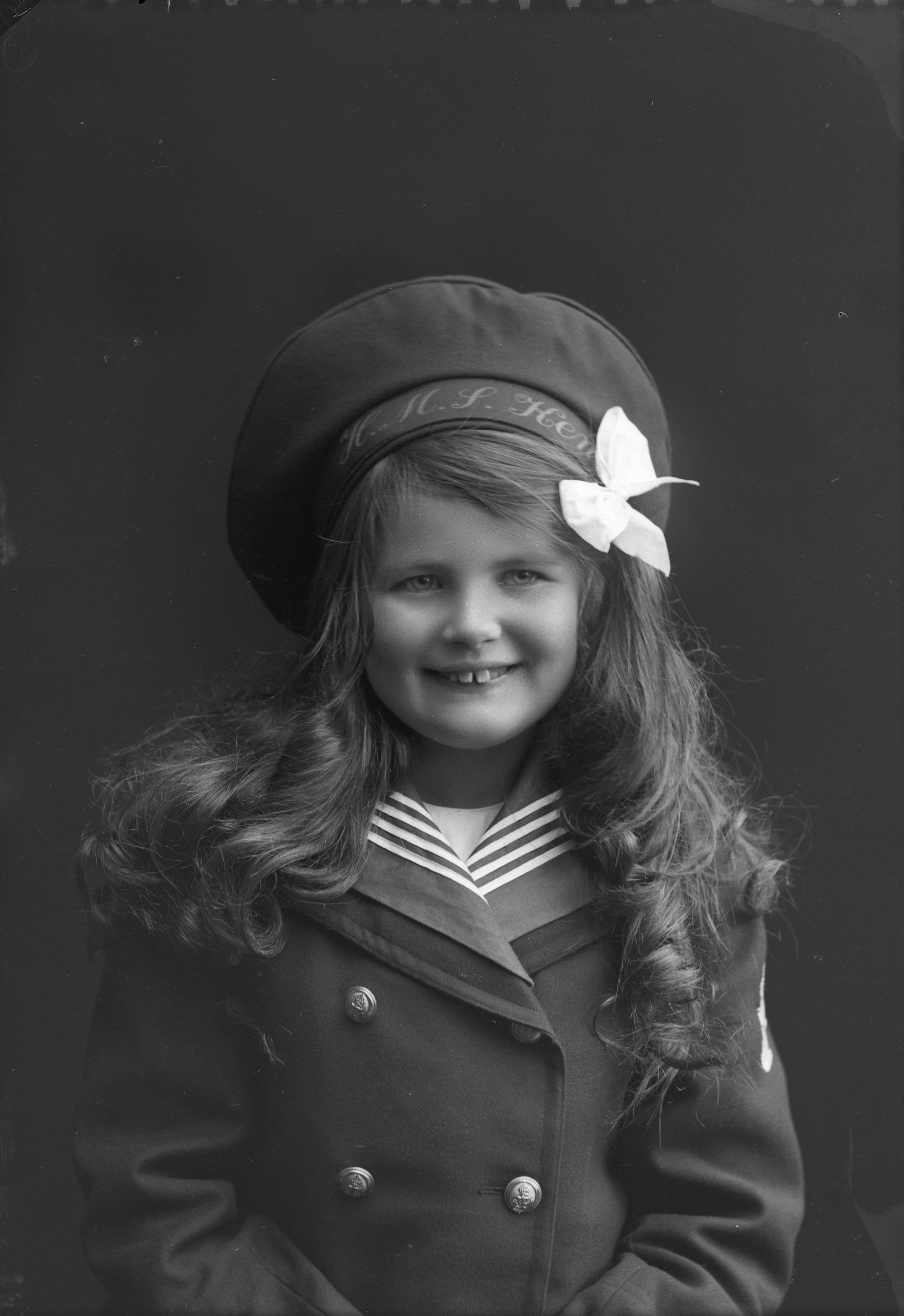 Porträtt i halvfigur av fru Tolls dotter i sjömanskostym och -mössa.