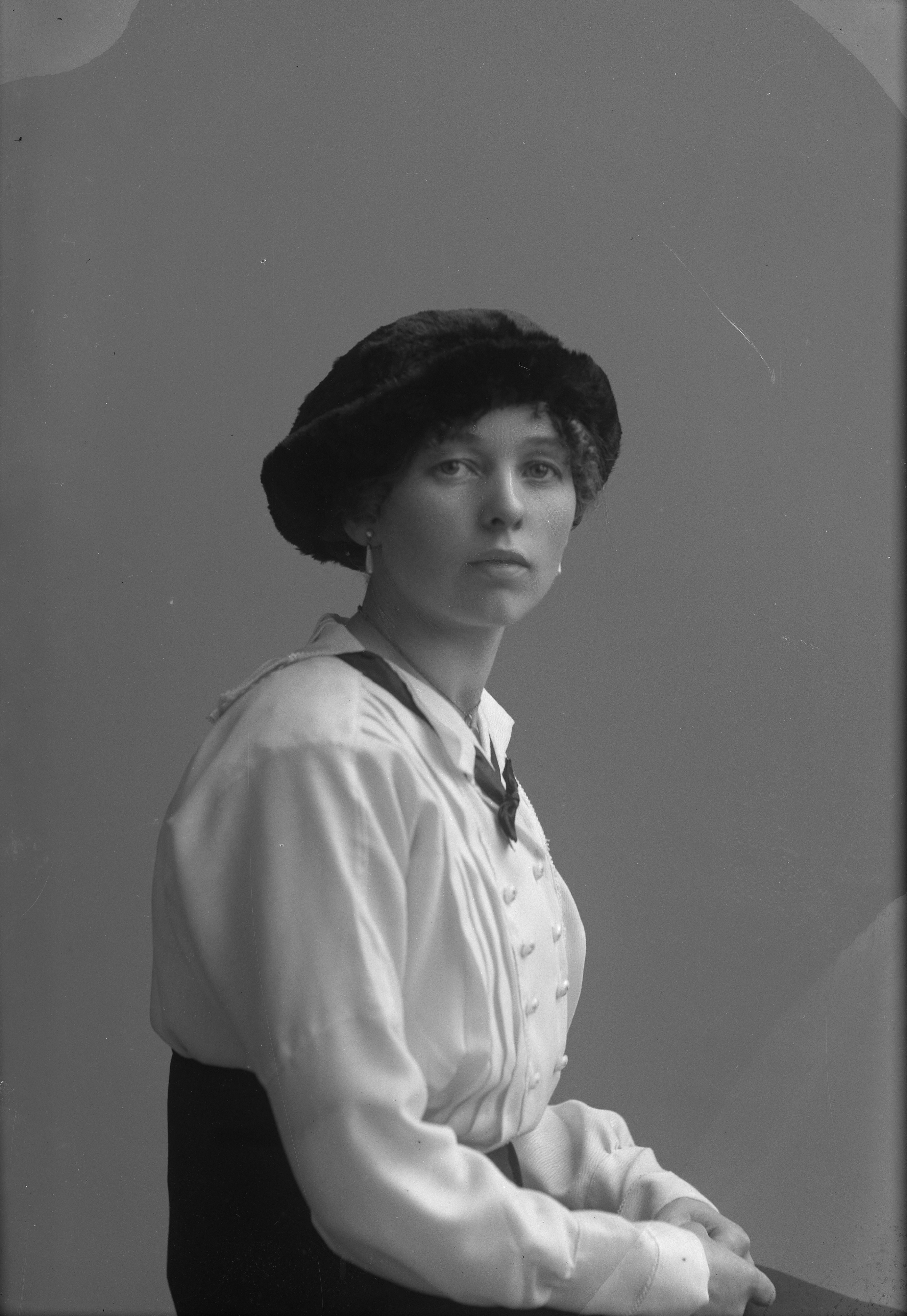 Porträtt i halvfigur av handelsbiträdet Elly Ebbestrand klädd i pälshatt.