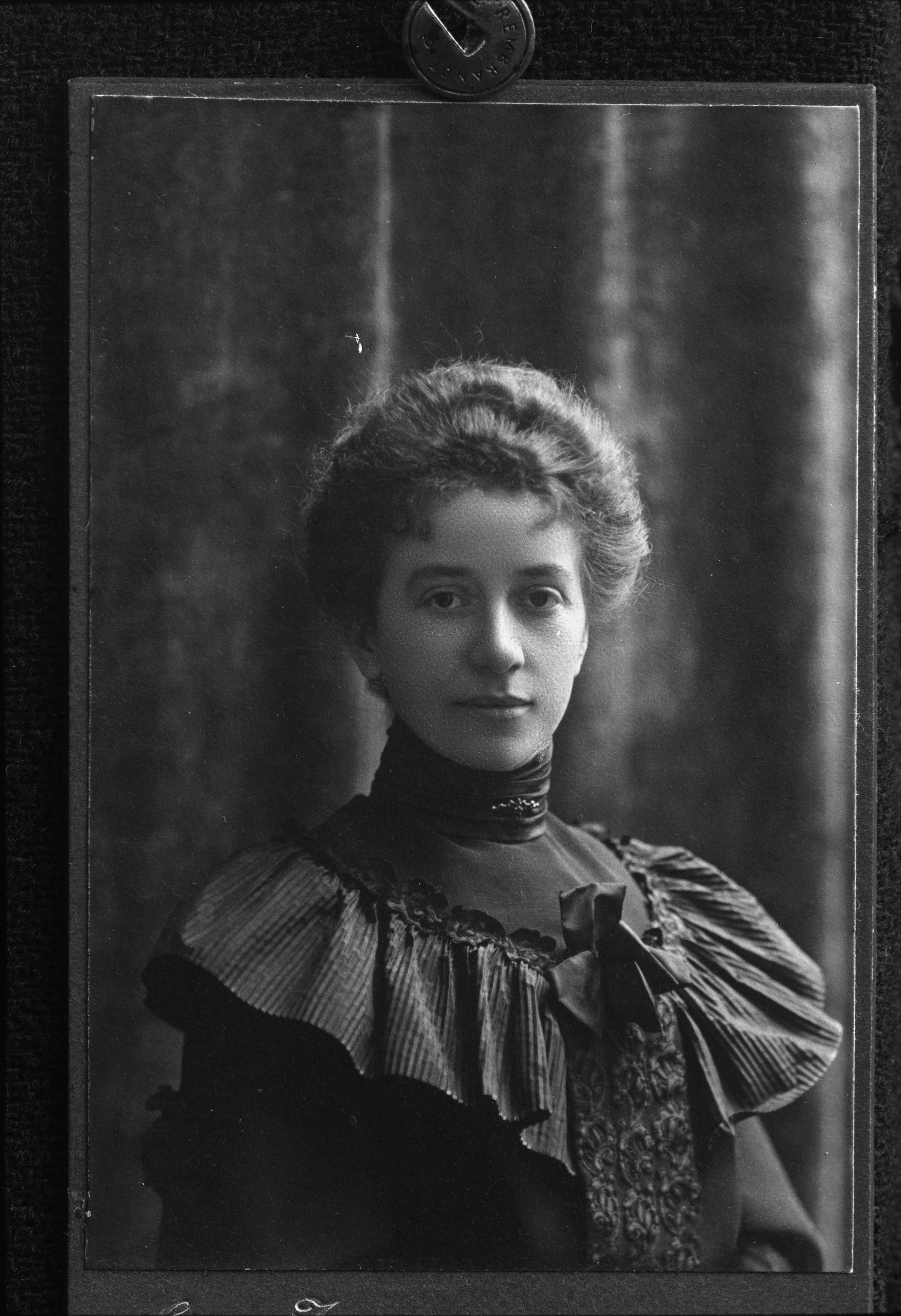 Porträtt i halvfigur av oidentifierad kvinna. Reprofotografi beställt av kemiingenjör Frantz Printzen (1862-1939).