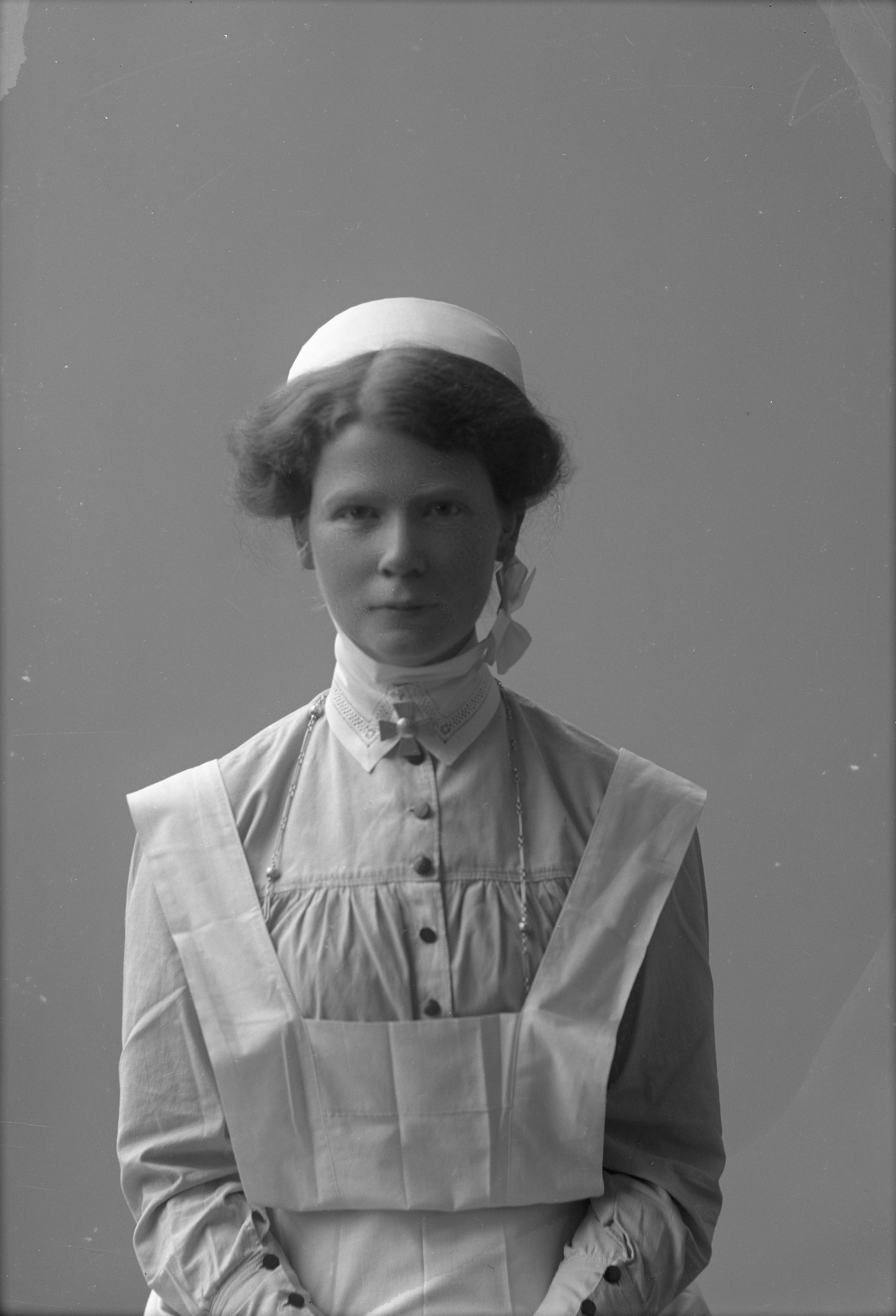 Porträtt i halvfigur av Ewy Jönsson, iklädd sjuksköterskeunifom.
