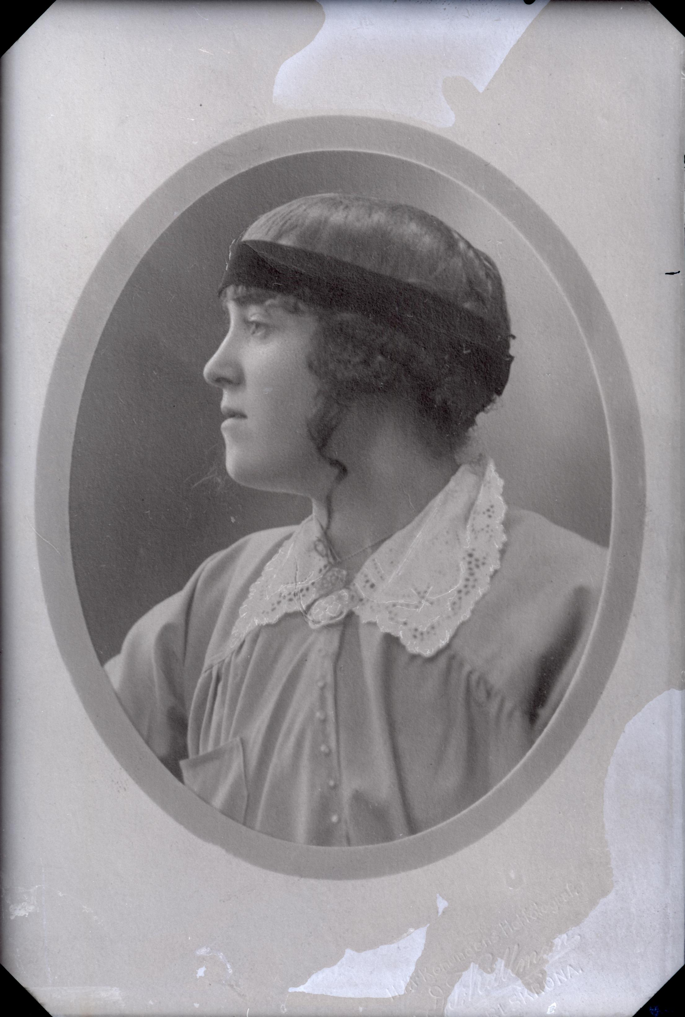 Porträtt i halvfigur, profil, av Maja Fernström vid automatrestaurangen Wega.