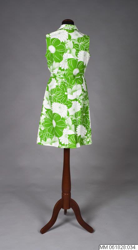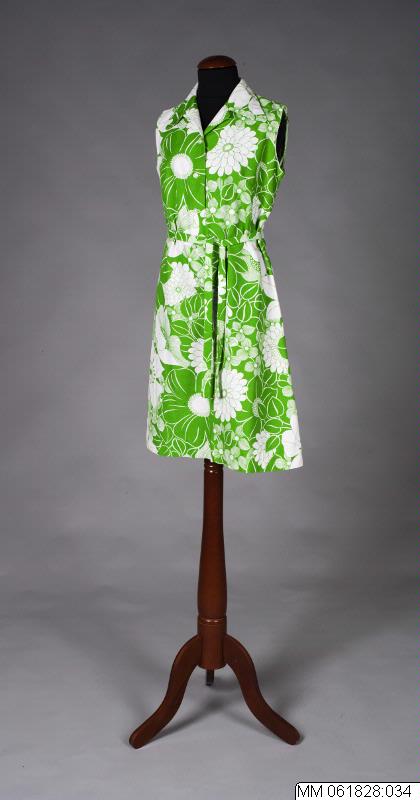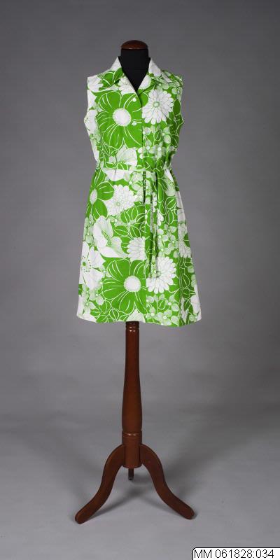 Ärmlös helskuren klänning i skjortblusmodell. Lätt utställd.Knäppning fram med 5 små plastknappar. Tygskärp att knyta i midjan.