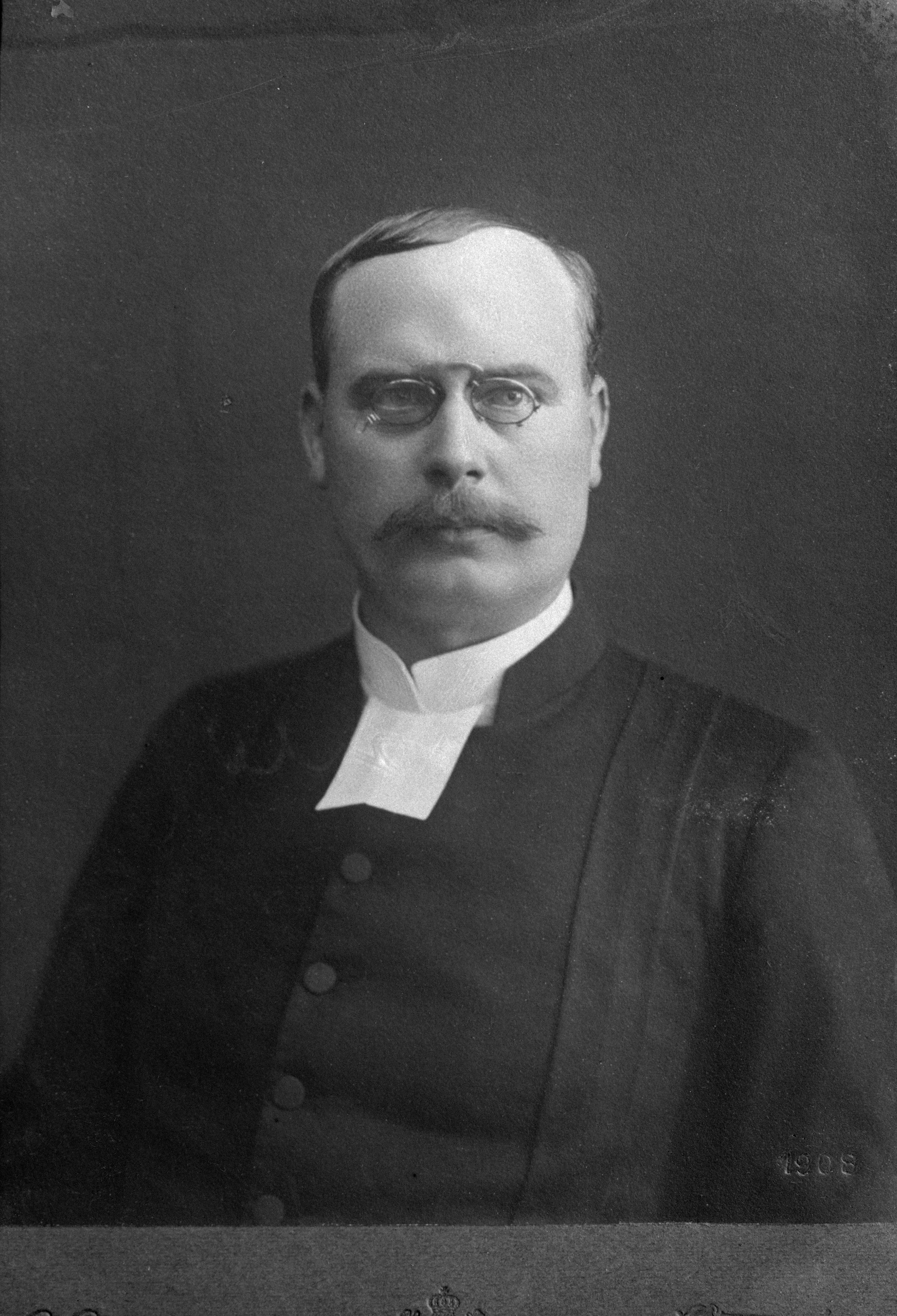 Porträtt i halvfigur av oidentifierad man, iklädd yrkesklädsel med prästkrage.