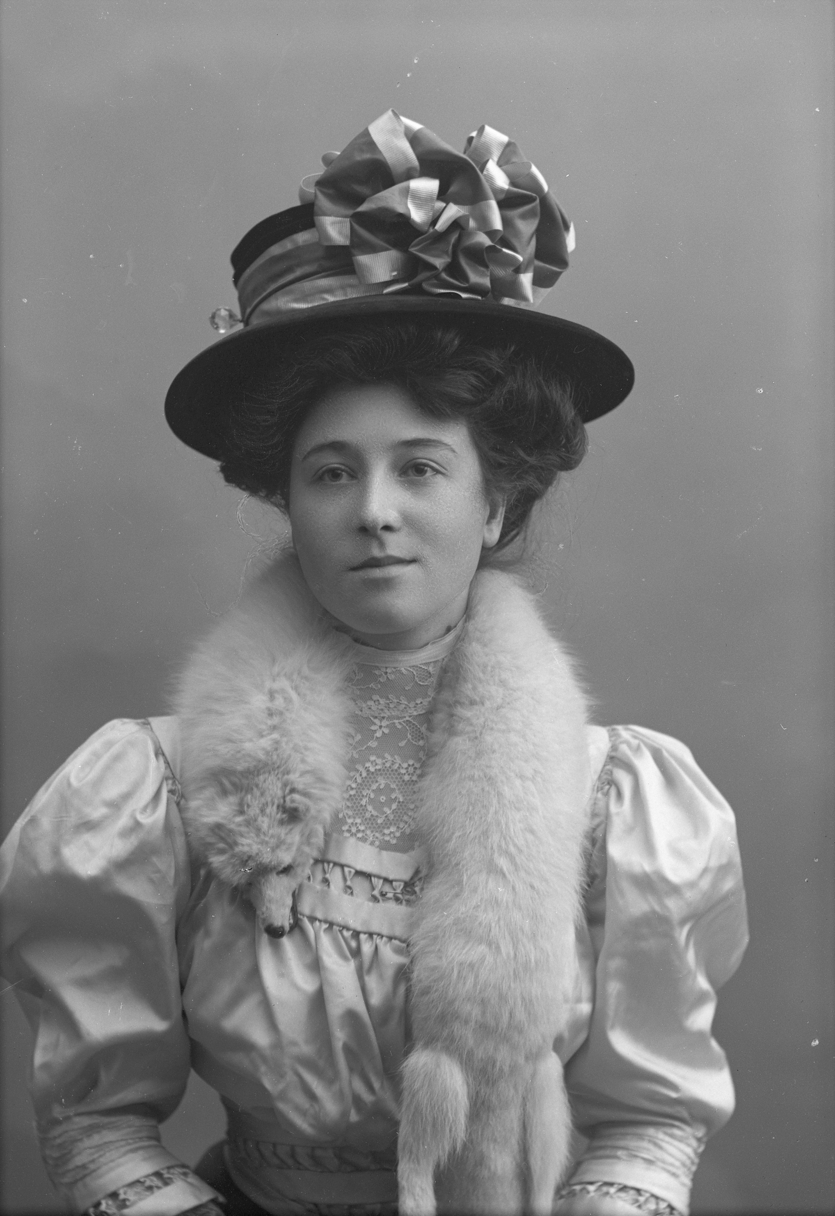 Porträtt i halvfigur av fröken von Platen i stor hatt och med rävpäls runt halsen.