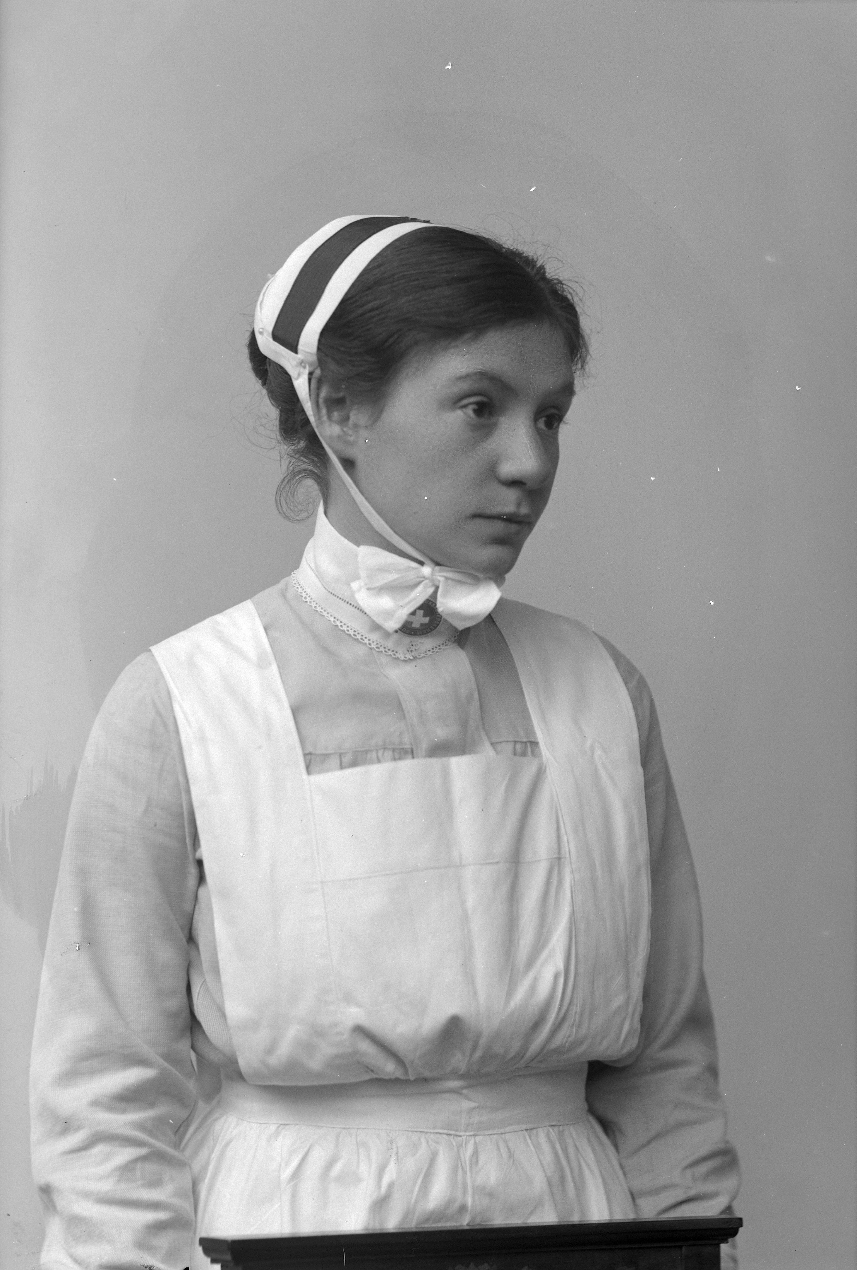Porträtt i halvfigur av Karin Loiuse Brundin i sjuksköterskeuniform.