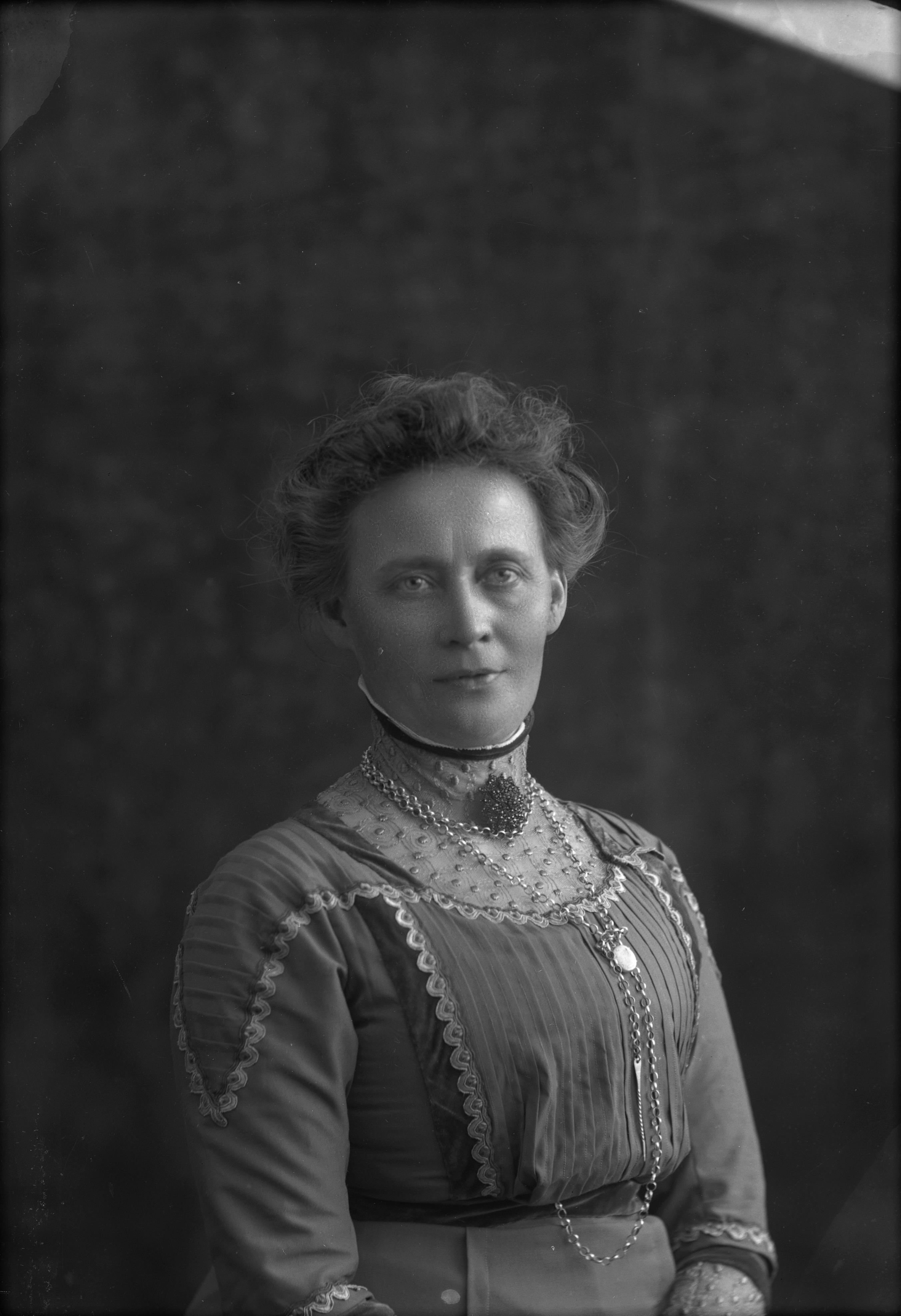 Porträtt i halvfigur av småskollärarinnan Kerstin Jönsson.