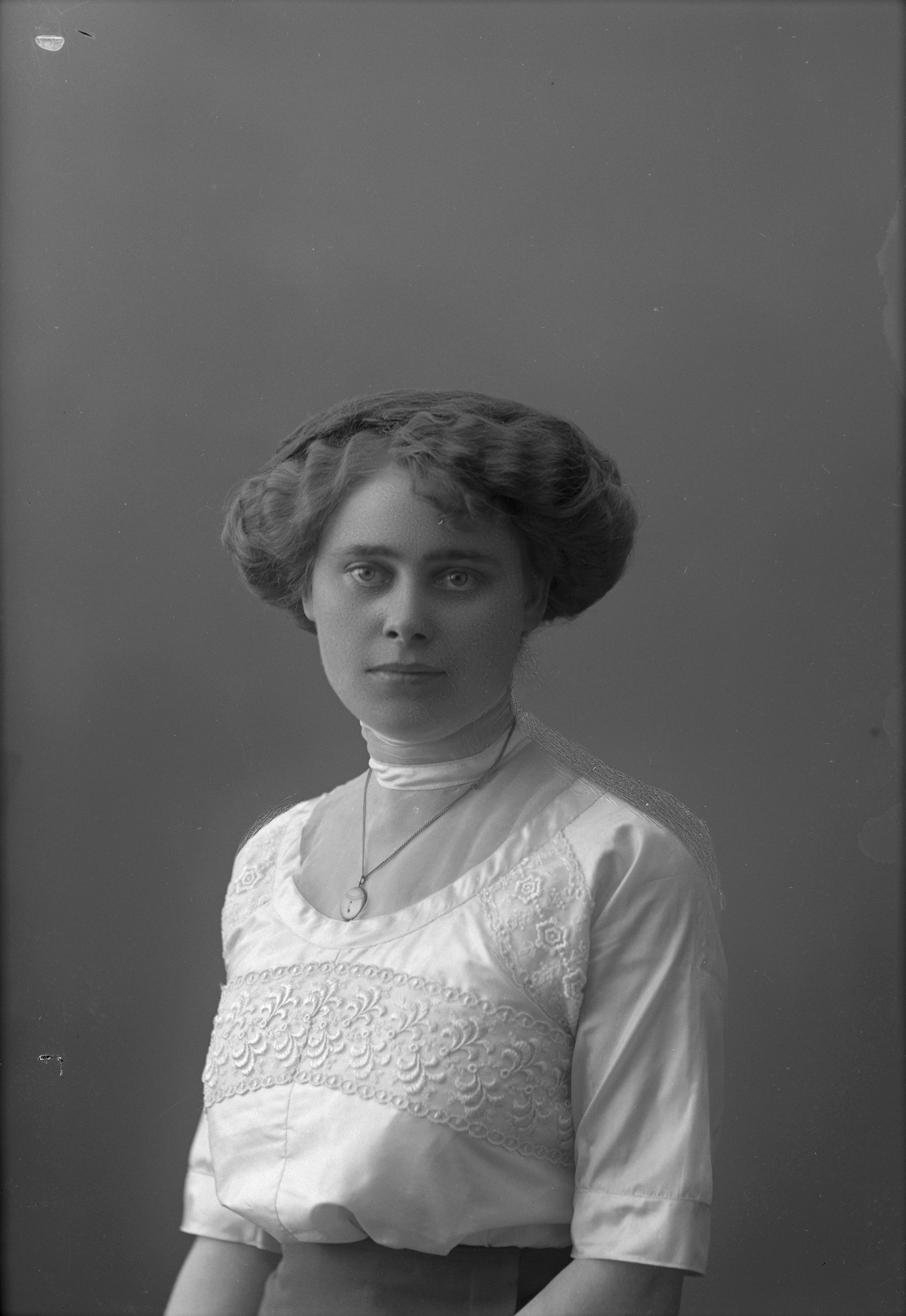 Porträtt i halvfigur av butiksbiträdet fröken Lückander.