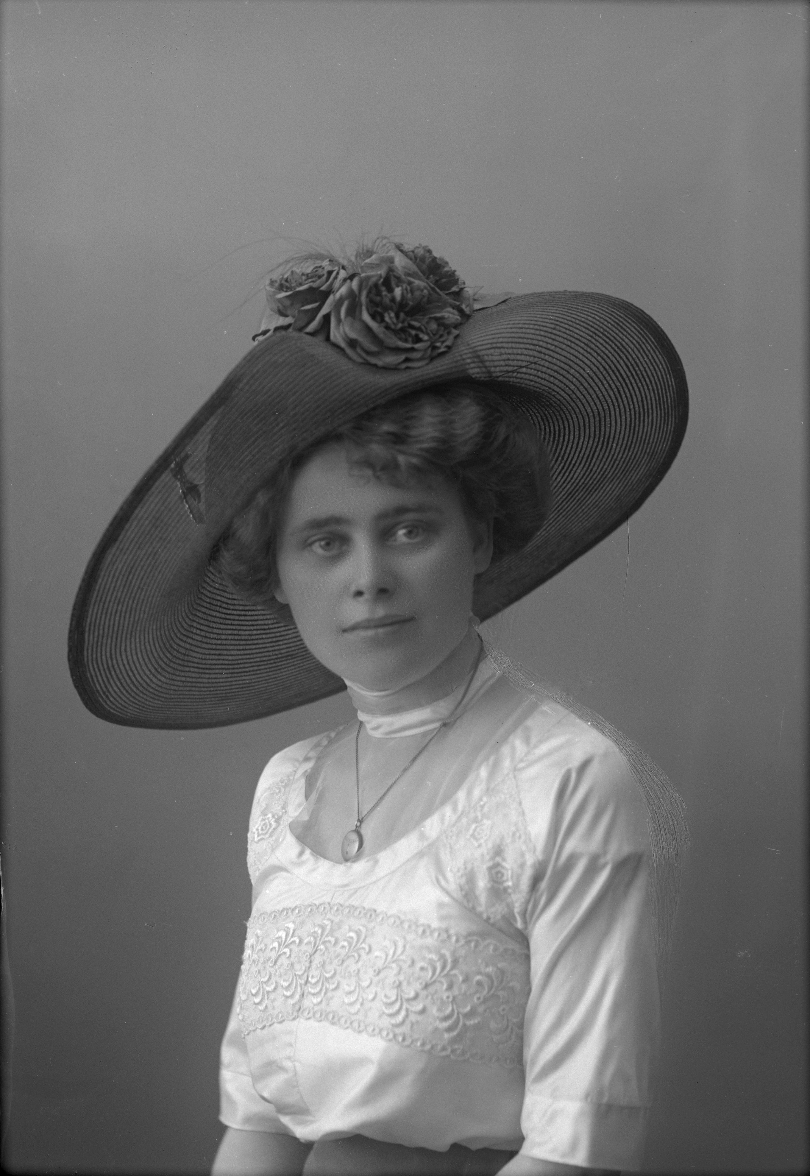 Porträtt i halvfigur av fröken Lückander, iklädd stor hatt.