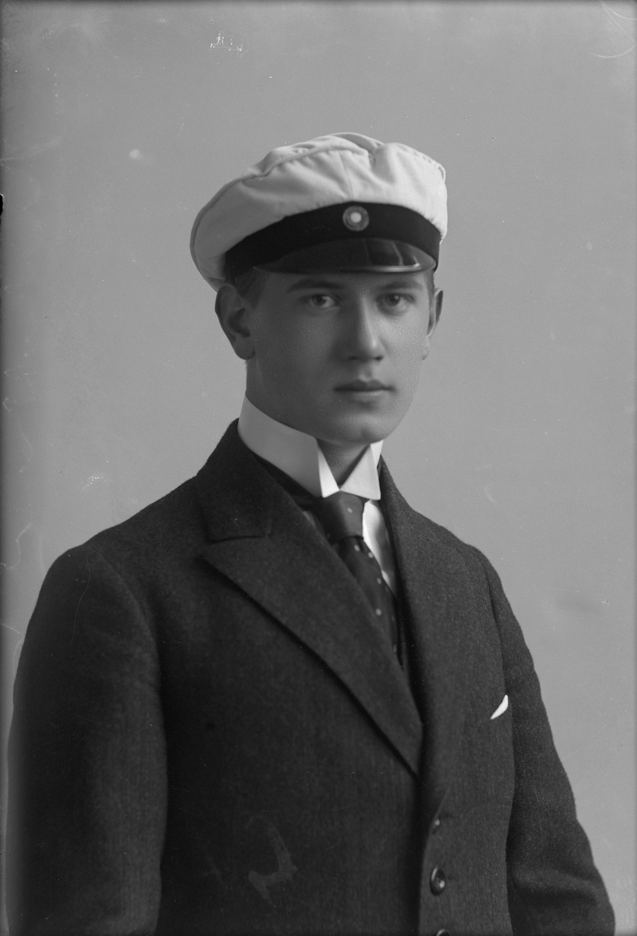 Porträtt i halvfigur av Sune Qvistlund i studentmössa.