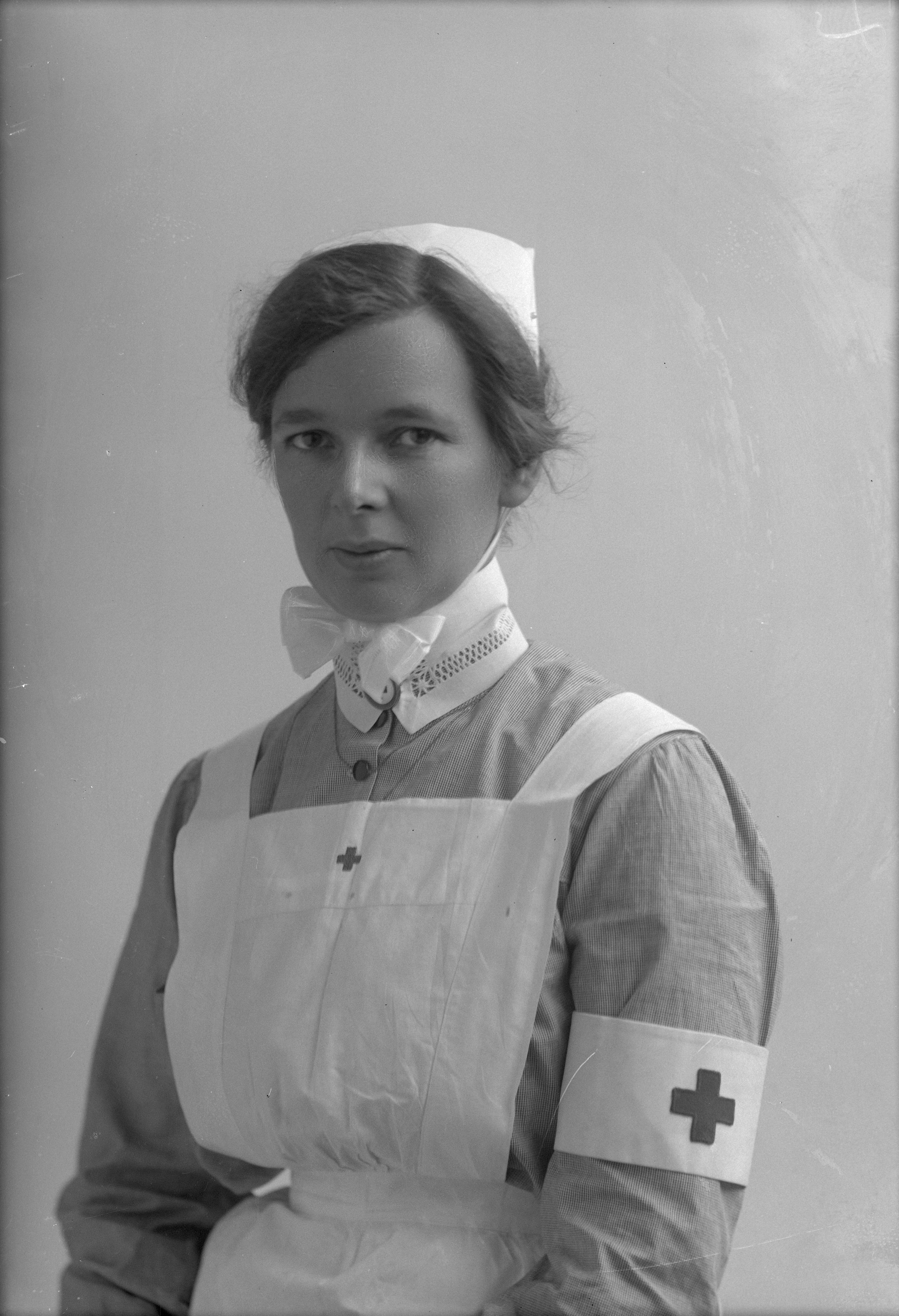 Porträtt i halvfigur av Greta Åkesson, iklädd sjuksköterskeuniform.