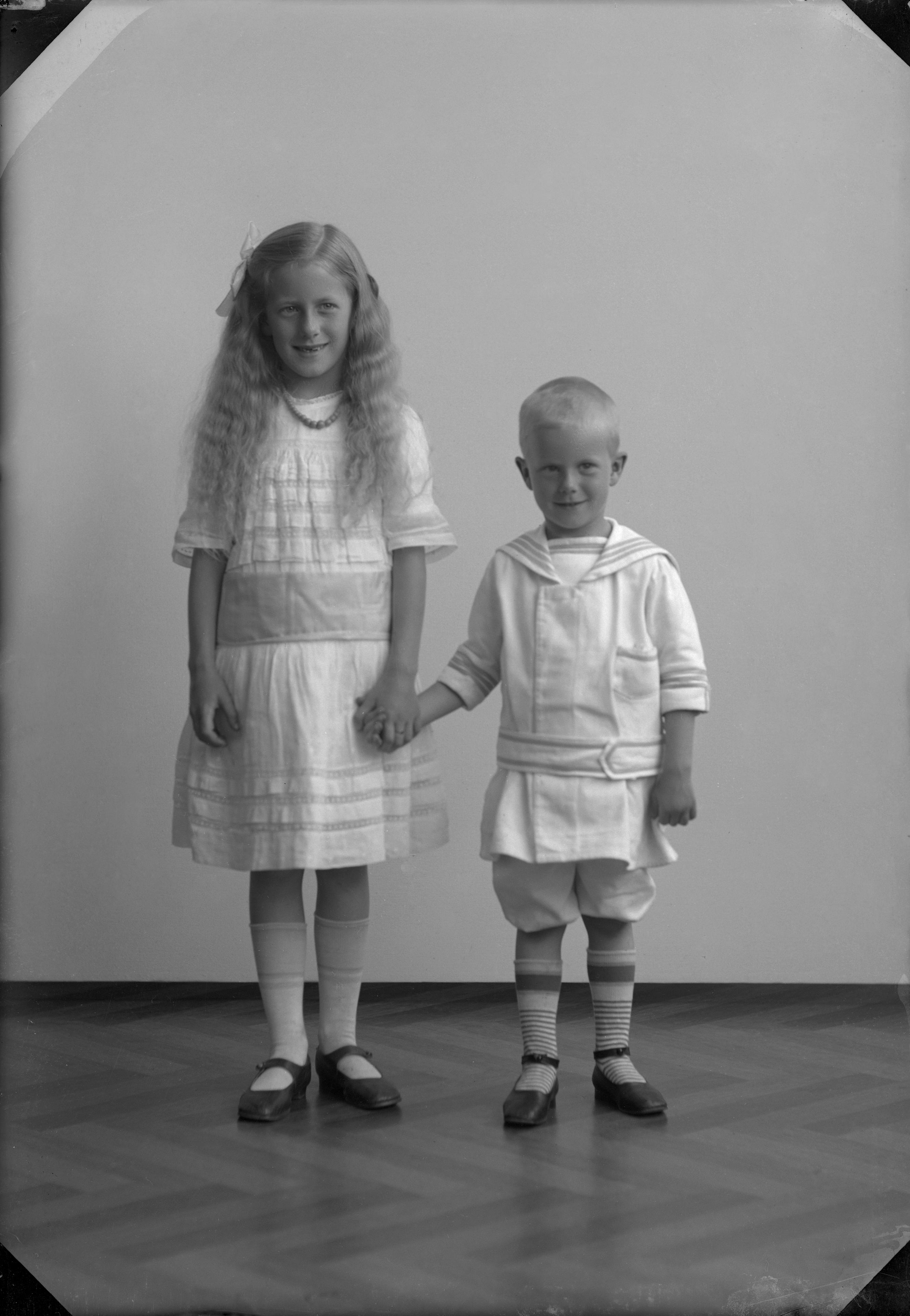 Porträtt i helfigur av Hilda Anna Maria Engström med brodern Sune Erik Algot.