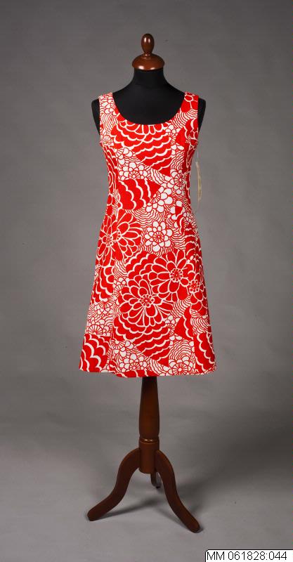 Helskuren figursydd ärmlös klänning. Framstycke i 3 vådor lätt utställd modell. Rund halsringning, lång blixtlåsi ryggen.