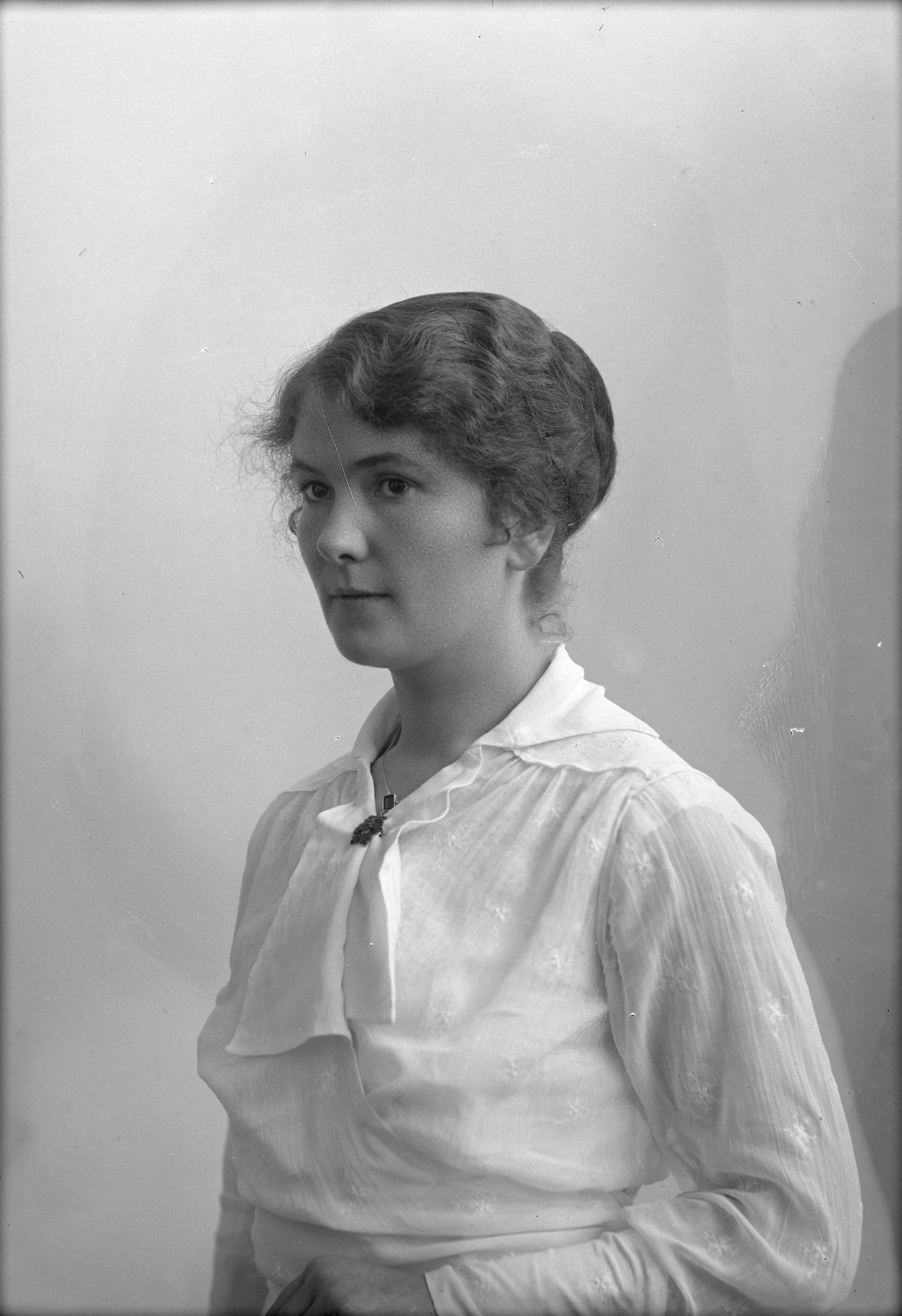 Porträtt i halvfigur av Mia Holst vid Tomelilla järnvägshotell.