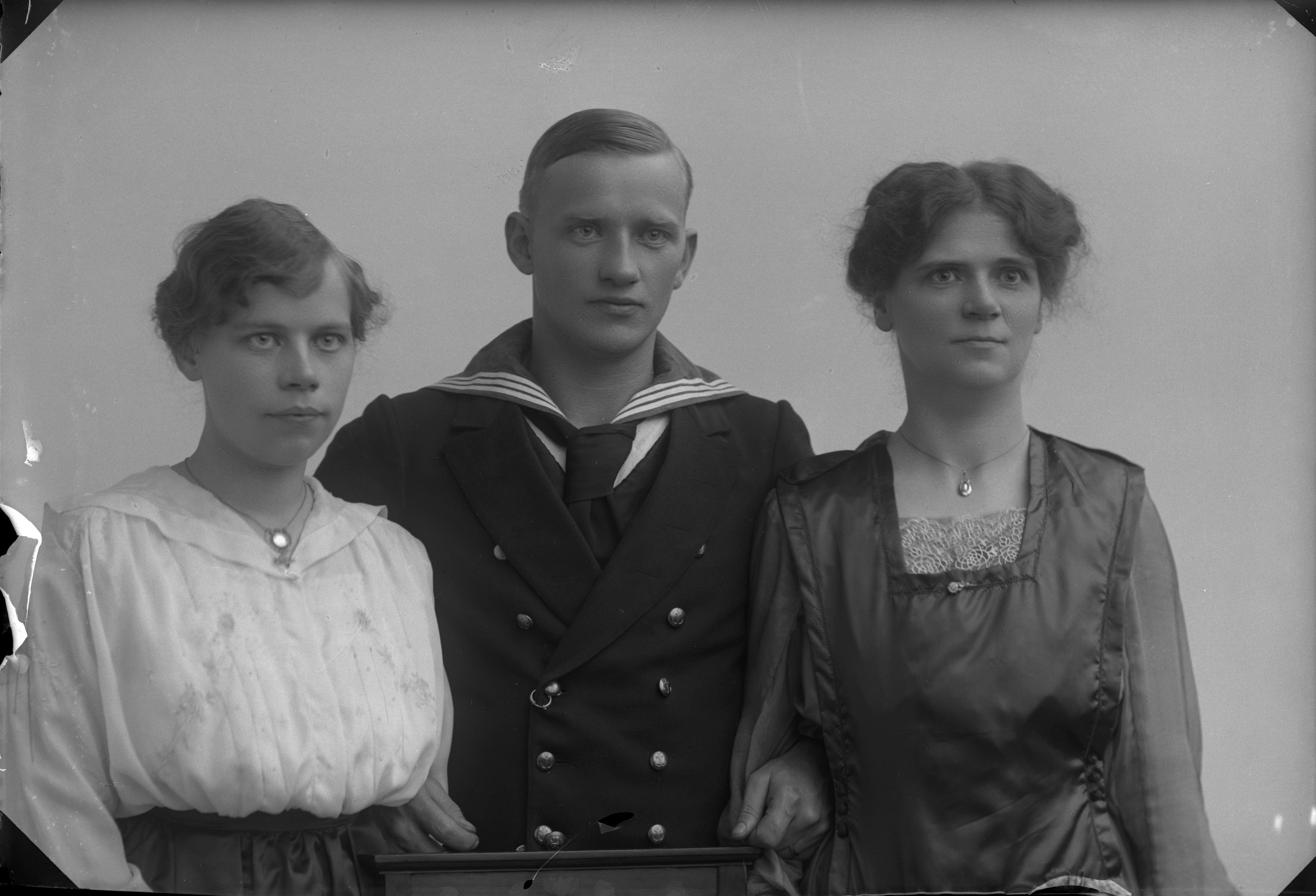 Porträtt i halvfigur av fru Gunn med okänd kvinna och man. Mannen iklädd sjömanskostym.