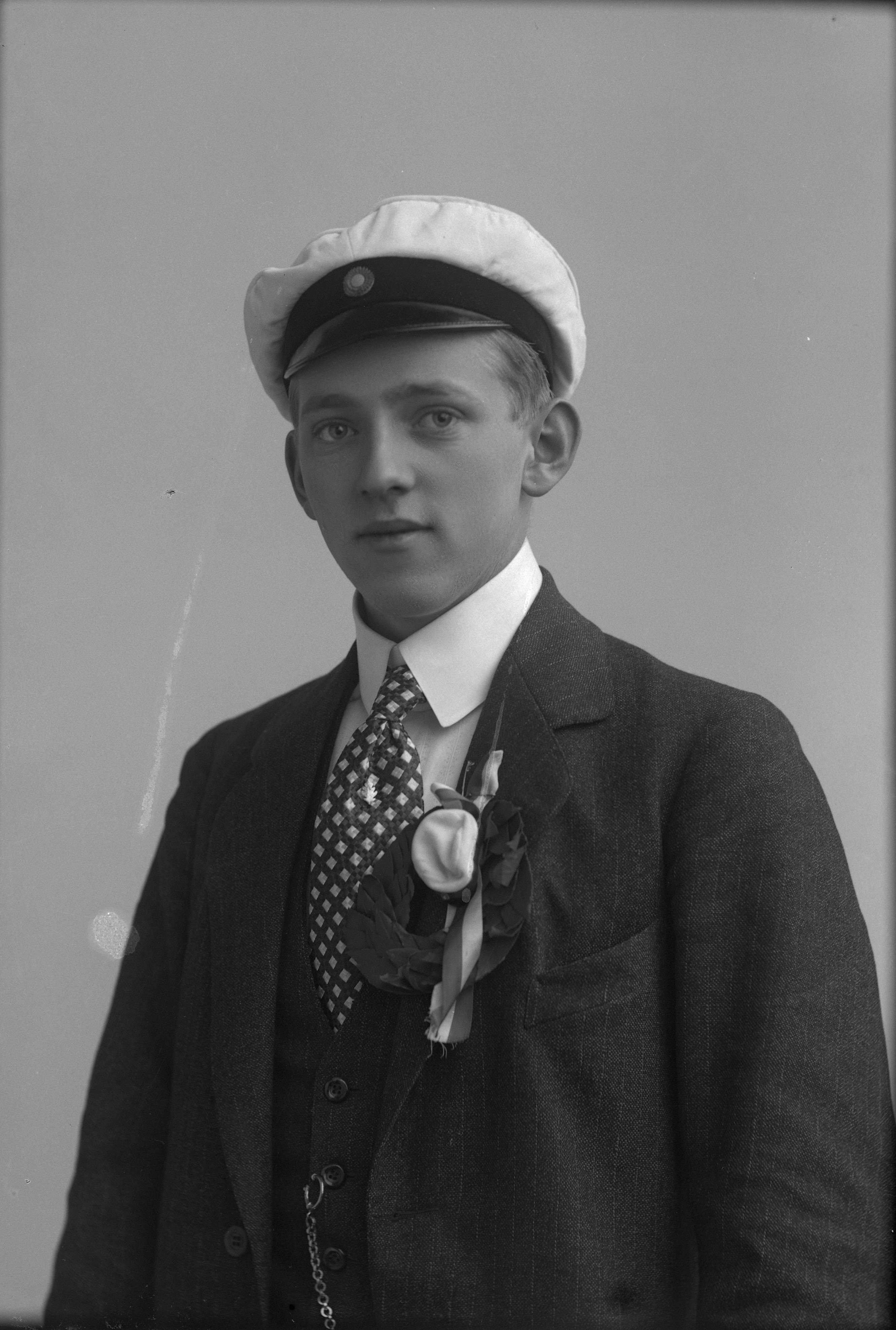Porträtt i halvfigur av Harald Schiller i studentmössa och med blomsterkrans i miniatyr på kavajslaget.